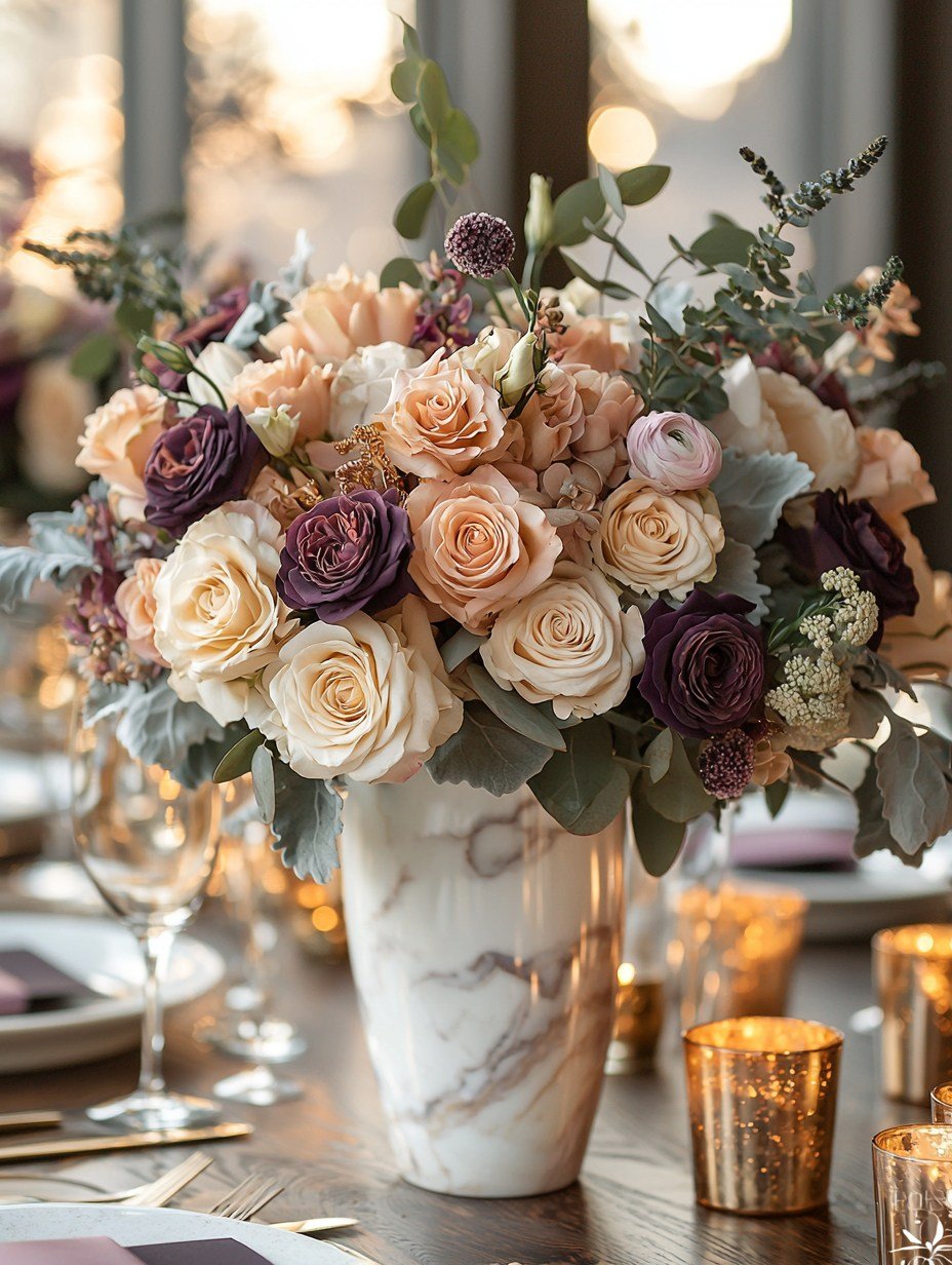 If you’re into a more modern, sleek look, this arrangement hits all the right notes. Soft pastels, pale pinks, and rich greenery come together in a contemporary vase that brings the entire scene into focus. The symmetry and clean lines of the design offer a polished, high-end aesthetic that would make any modern wedding feel elevated.