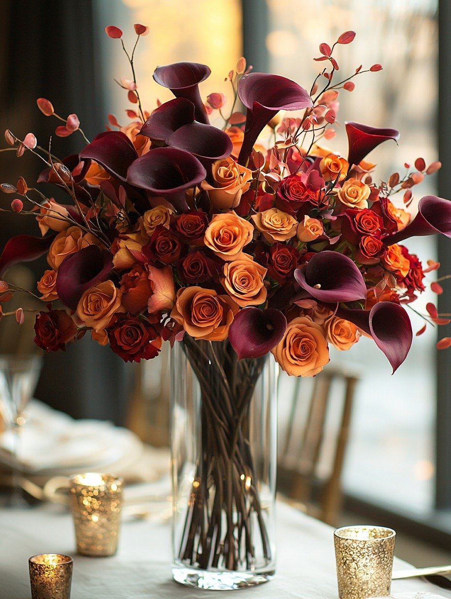 Starting with this lush display of deep purples and warm tones, this arrangement feels like a kiss of autumn in a bouquet. The calla lilies and roses complement each other so gracefully, you almost forget they’re together in a vase. And those delicate accents of berry branches add just enough whimsy to keep things intriguing.