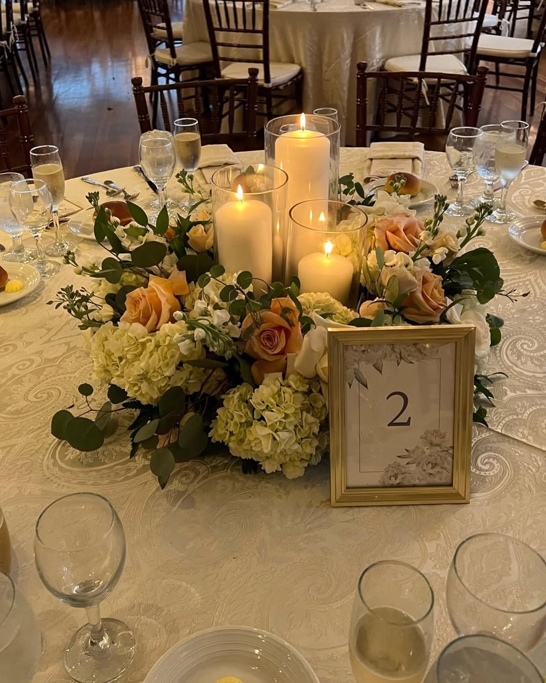 Here we have an ultra-elegant centerpiece that doesn’t skimp on charm. The soft creams and peaches mixed with the subtle pops of greenery create a rich, elegant atmosphere. Paired with tall candles, this arrangement has the perfect balance of warmth and sophistication. It’s refined, timeless, and a great choice for a luxe fall wedding.