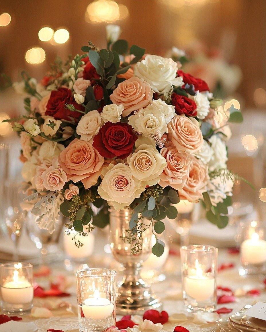 This lush arrangement screams luxury and glam. The deep red roses combined with rich greenery and a touch of gold in the vase create a bold yet elegant look. The high-rise centerpiece makes a statement at any table, towering over guests in a way that’s both imposing and romantic.