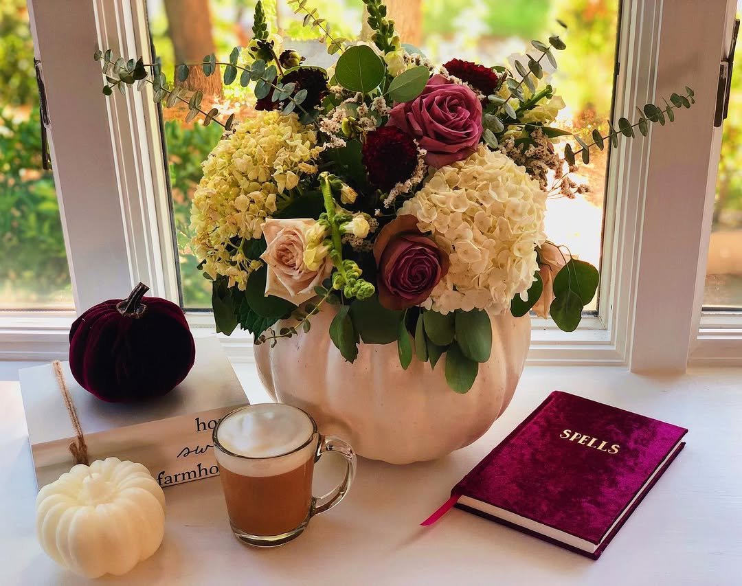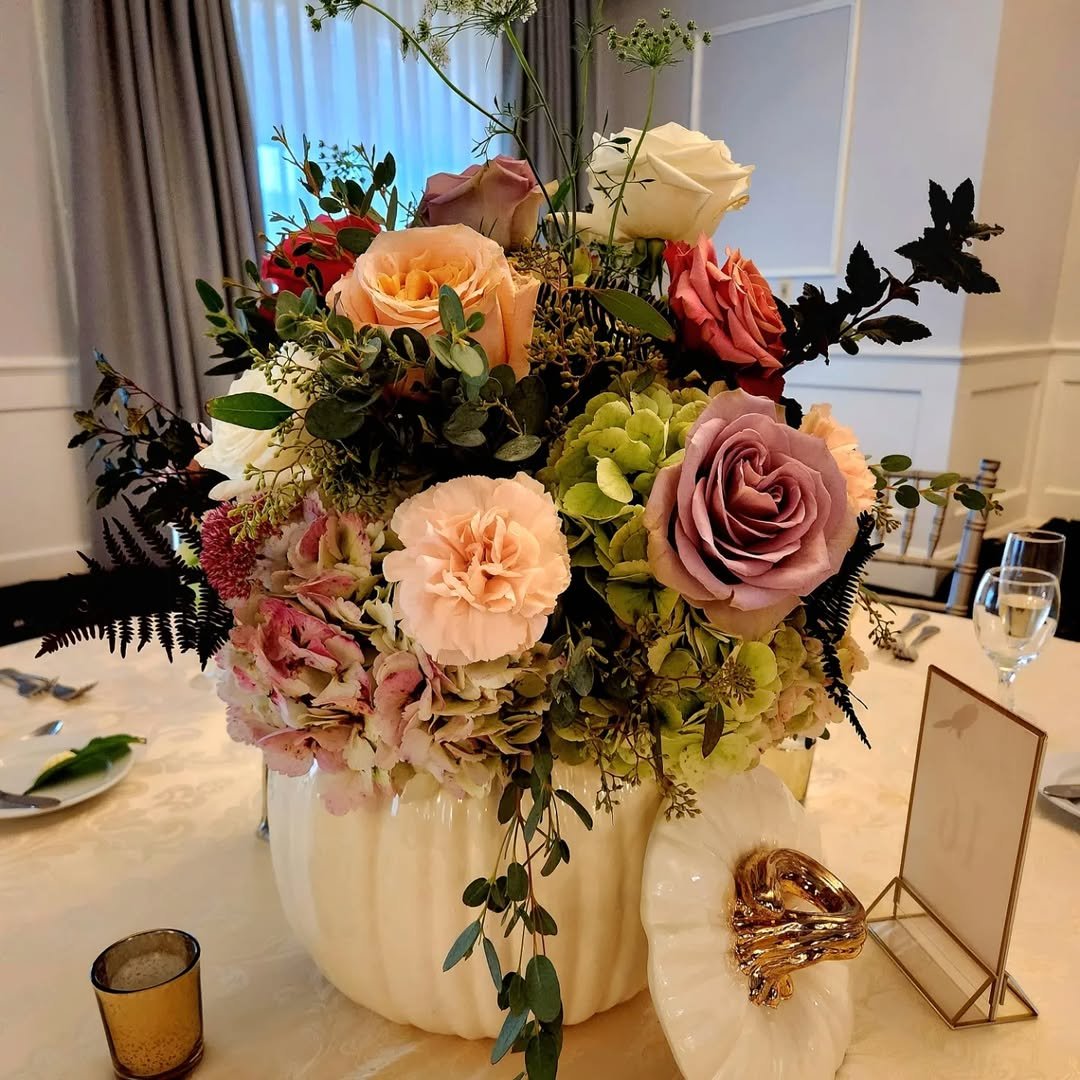 This one takes the pumpkin trend and elevates it. The white ceramic gourd acts as a romantic vessel for dusky mauves, soft oranges, pale greens, and whispery hydrangeas. The gold stem detail? A chef’s kiss.