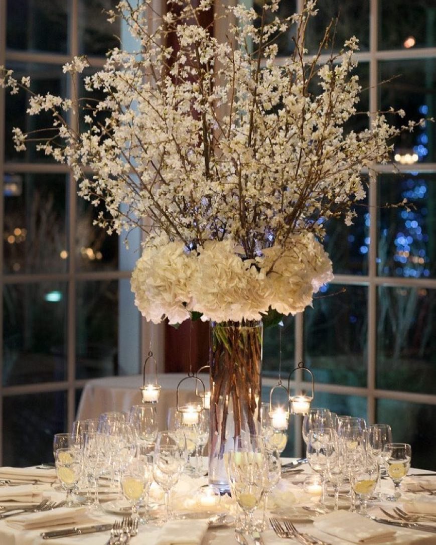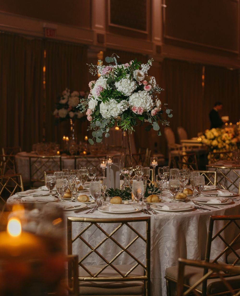 Elegant and soaring, this grand arrangement of fluffy white hydrangeas and pale pink roses stands tall on a clear vase like it’s wearing heels to the gala. Tucked into the background? A sea of flickering candlelight and plush place settings.