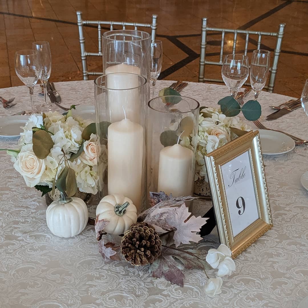It’s an arrangement that doesn’t need much extra. The pumpkins, the soft lighting, and that hint of greenery from the eucalyptus create a cozy yet luxurious atmosphere—fall weddings, this is your vibe.