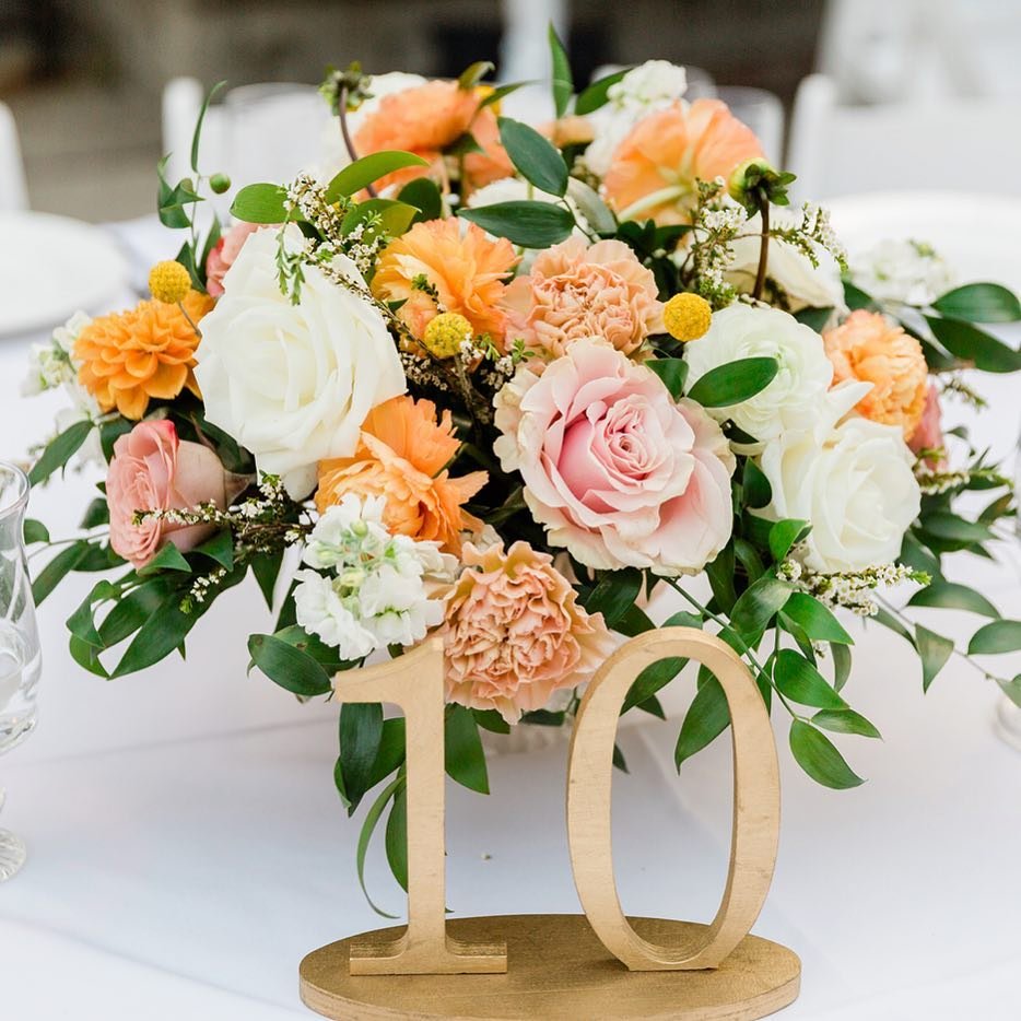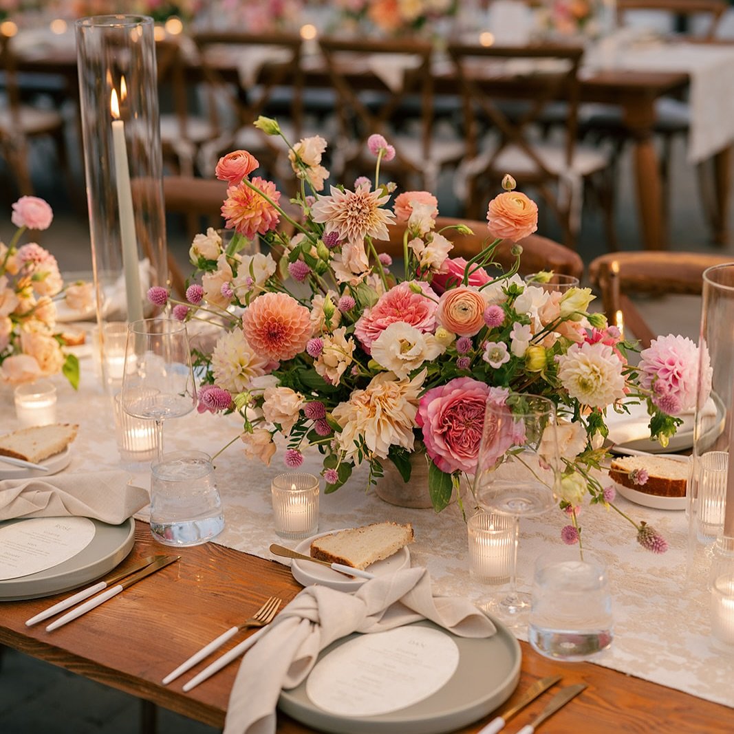 This one feels like a soft breeze on a September afternoon. A garden-inspired mix of blush, peach, creamy whites, and subtle greenery makes this centerpiece feel fresh and endlessly romantic. It’s the kind of look that goes with everything and never feels out of season—even when surrounded by falling leaves.