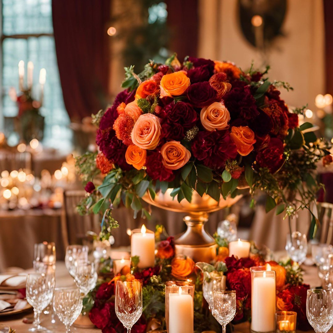 Here, we have the perfect fall blend of deep reds, golden yellows, and rich oranges. With a mix of dahlias, roses, and various fall florals, this centerpiece truly feels like a luxurious harvest feast. The golden accents and soft lighting bring a warm, inviting energy, while the fresh green leaves add balance and life.