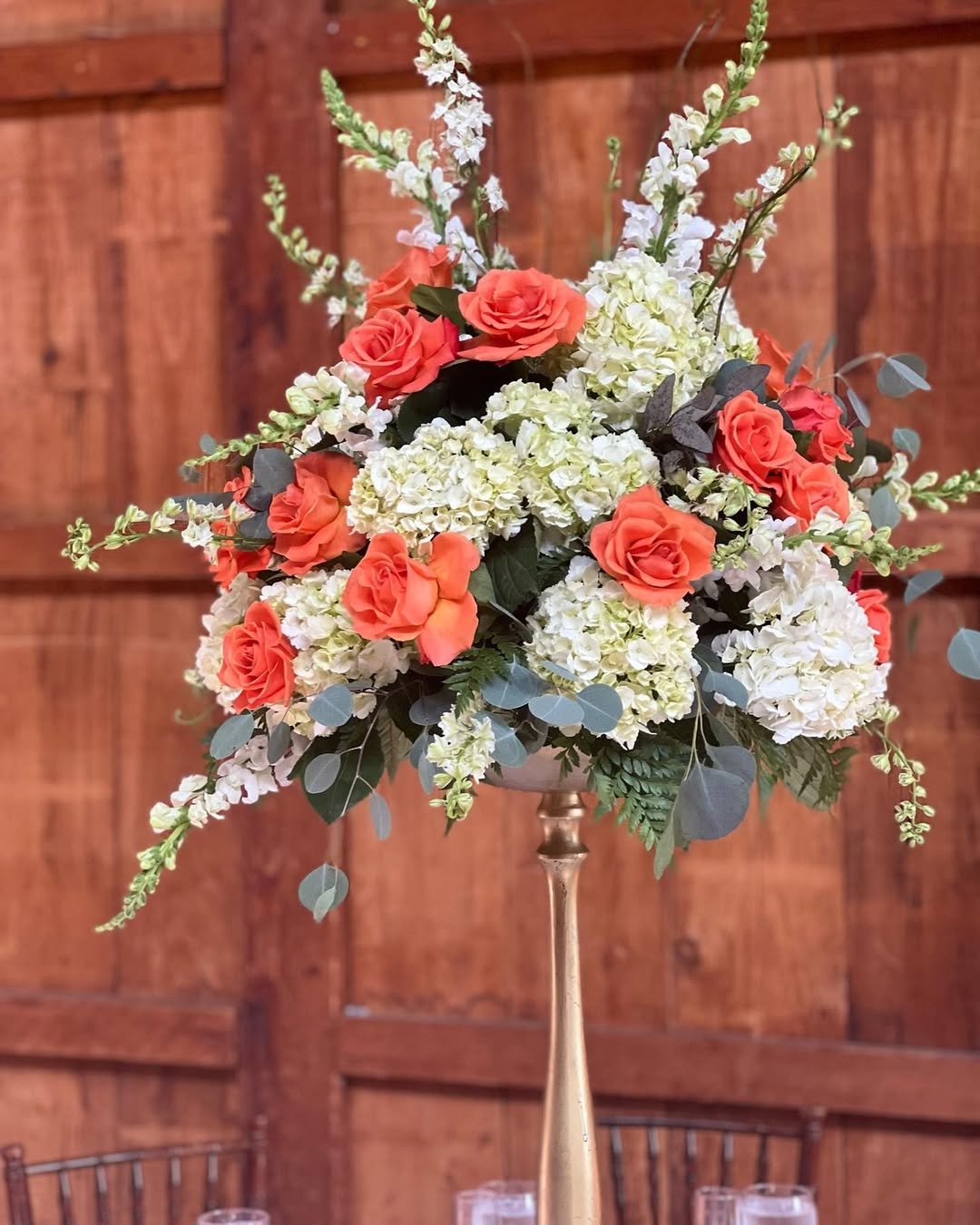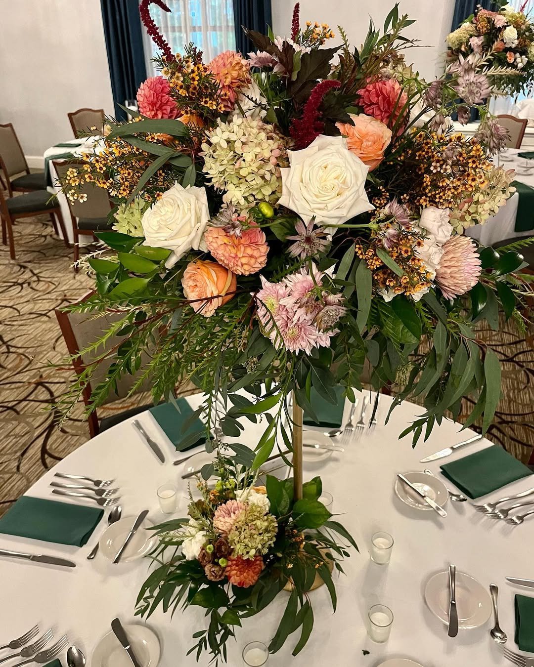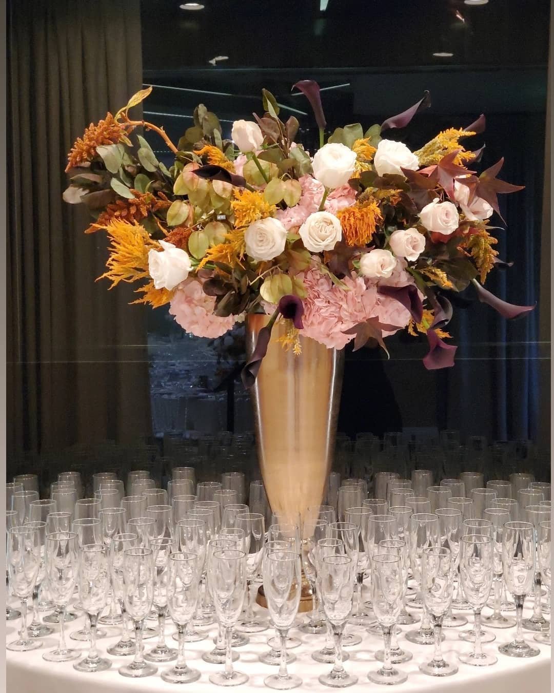 Talk about fall foliage turned floral art. This tall arrangement hits that perfect note between wild and elegant. Burnt orange leaves, golden mums, and soft apricot roses cascade like they’re caught mid-drift on an October breeze. The height adds instant grandeur without blocking views—ideal for long-table receptions with a rustic-modern twist.