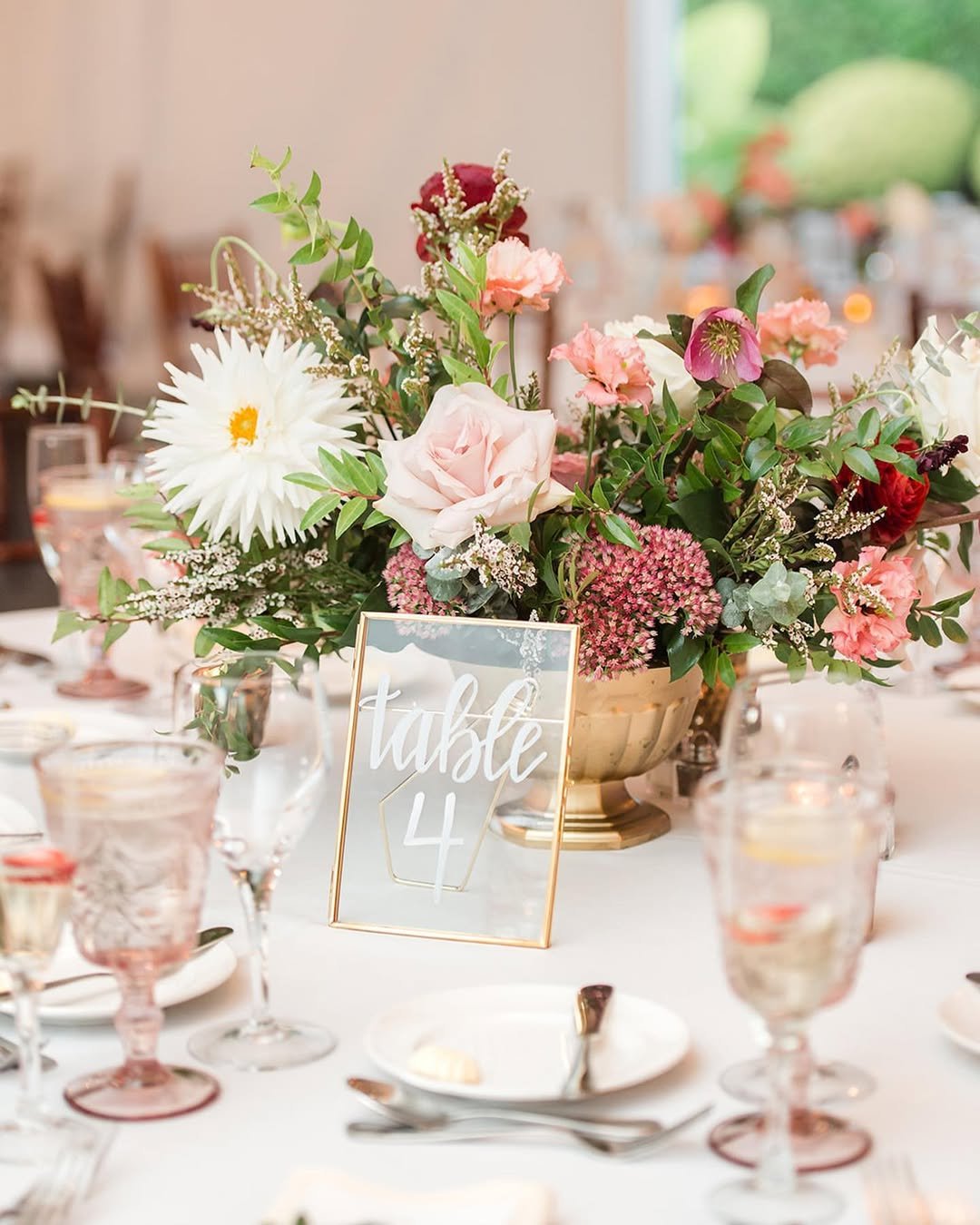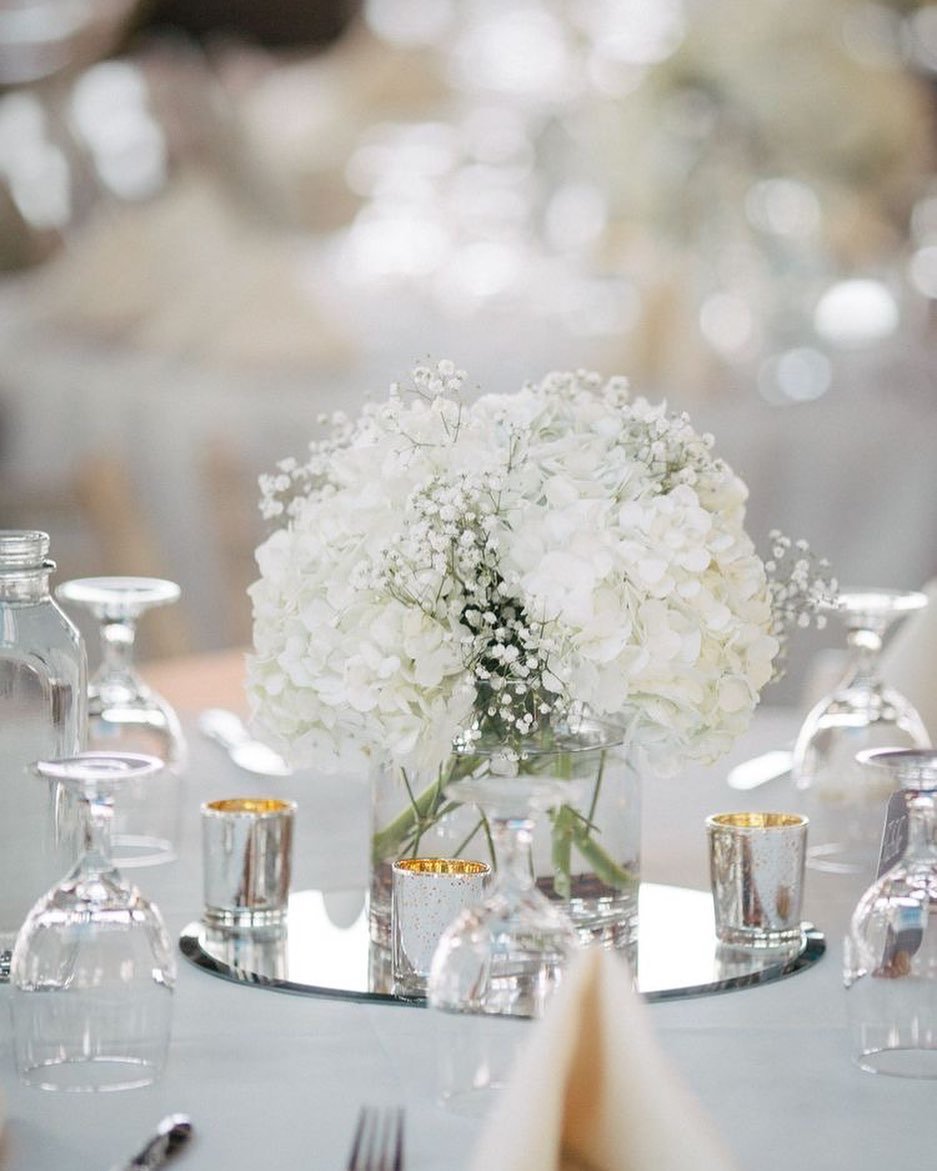 For the classic wedding lover, this understated beauty does the trick. White blooms, soft greenery, and elegant glassware work together to create a refined, timeless arrangement. The clean, simple lines of the centerpiece allow the flowers to speak for themselves—delicate and pure.