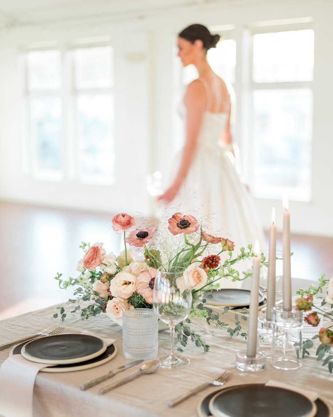 If you could bottle the magic hour of a fall day, this would be it. Soft dahlias, garden roses, and fluttery ranunculus in peachy pinks and warm blushes feel just kissed by the sun. Everything’s grounded in airy elegance—like a Parisian garden party relocated to a cozy vineyard.