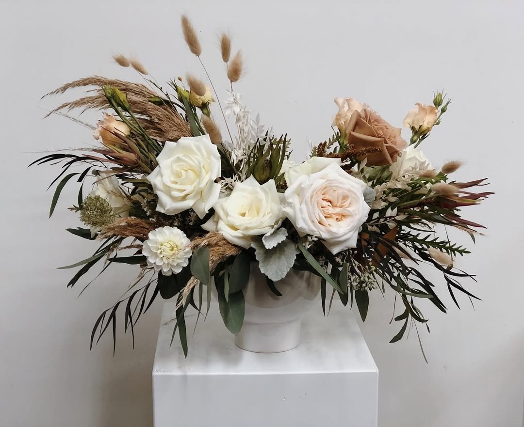 This one’s all about the statement. A towering golden vase overflowing with deep plums, dusty pinks, crisp whites, and mustard golds. The mix of structured roses with feathery filler gives this piece presence—like the fashion-forward cousin of a traditional fall bouquet.