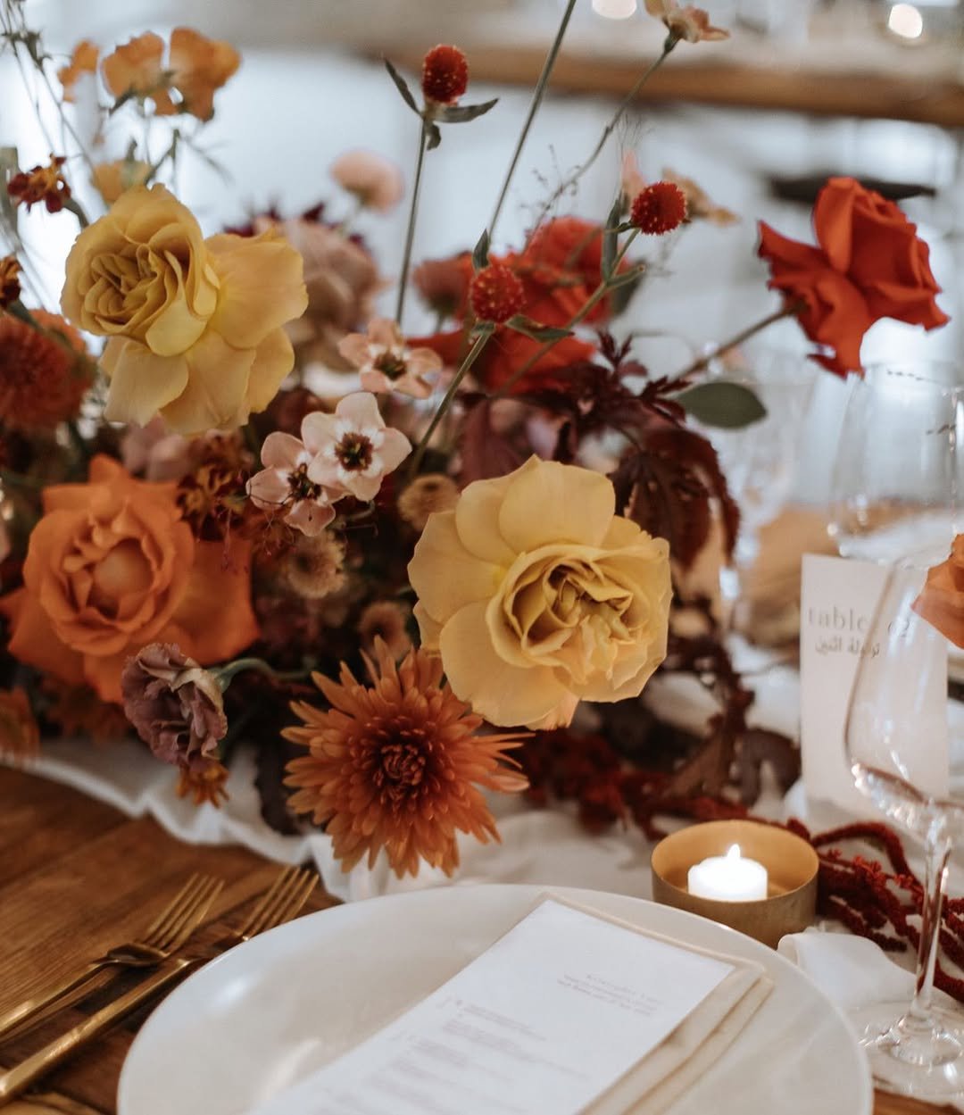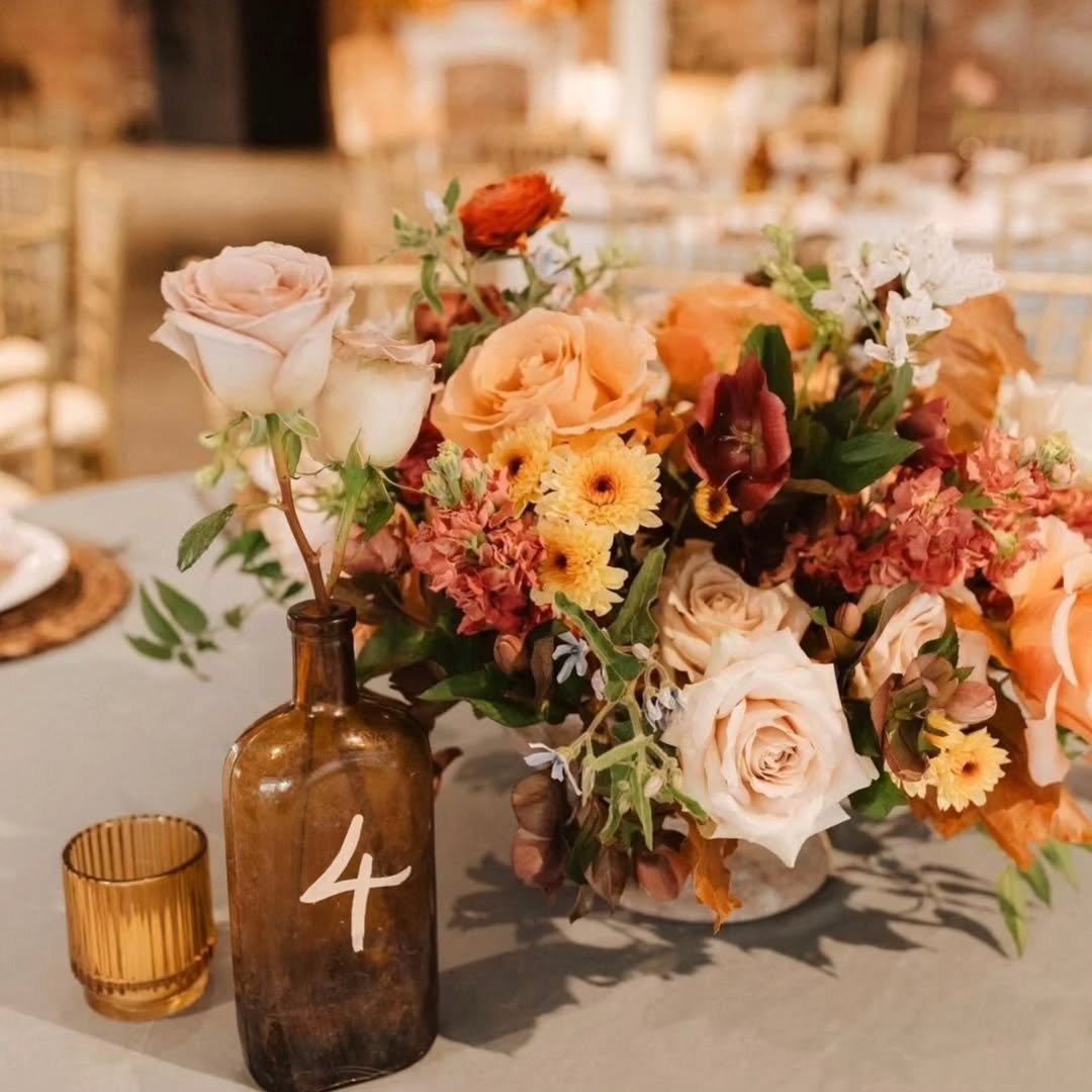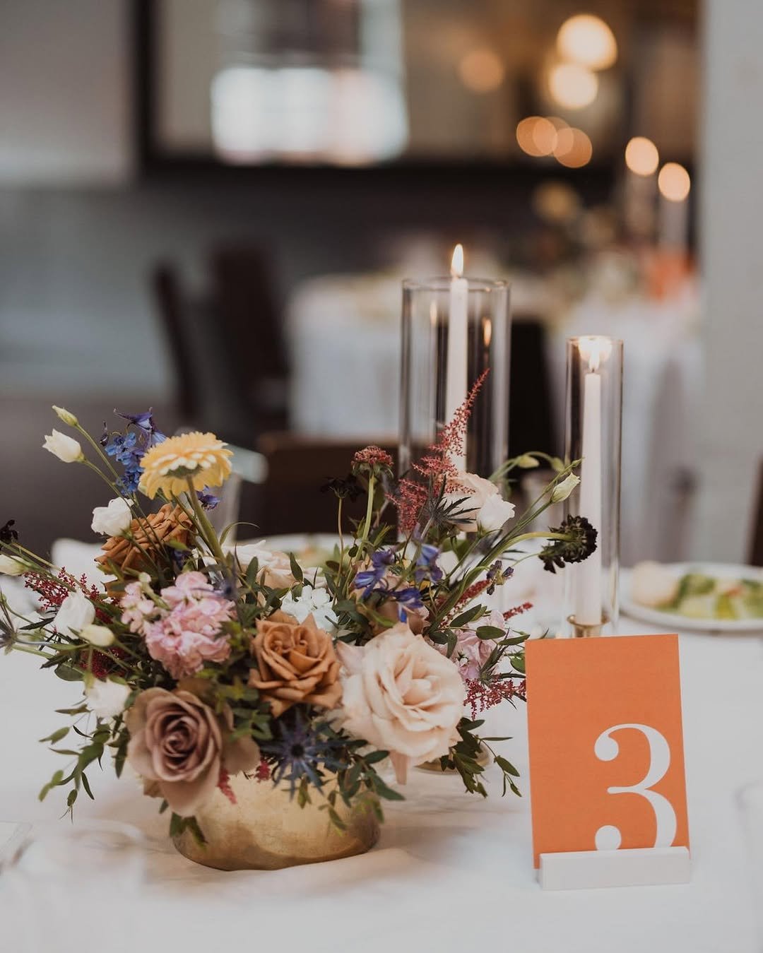 Bold, earthy, and just a bit moody—in the best way. This low arrangement keeps things grounded with toffee roses, burgundy sprigs, soft blushes, and dusty blue accents. Paired with smoky black candlesticks and a bold orange table number, it nails modern fall without being overdone.