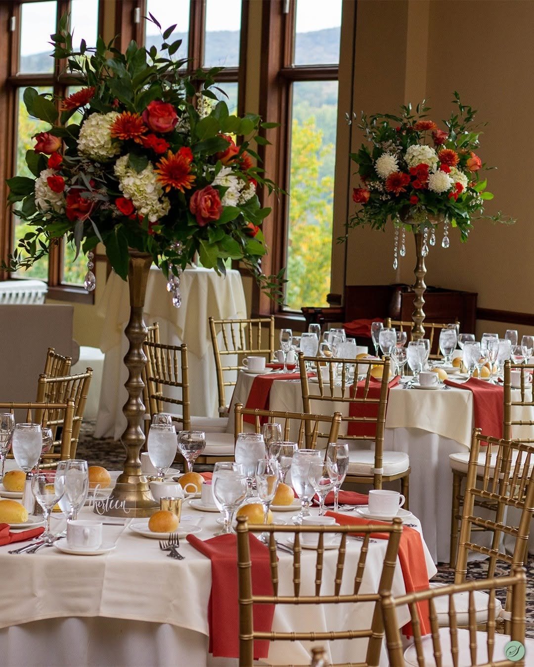 This is textbook autumn elegance. Big, bold arrangements bursting with creamy hydrangeas, rust-red dahlias, and rich greenery—perched on dramatic gold pedestals with crystal drops for a hint of glam. The orange napkins and cozy venue backdrop make it even more inviting.