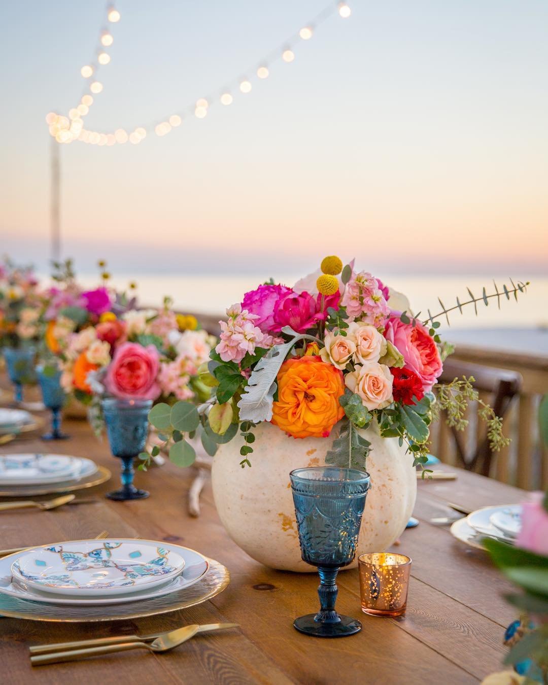 Yes, that’s a pumpkin vase—and no, it’s not basic. @jubilee_flowers gave it a coastal twist with juicy citrus tones, hot pinks, and playful textures. Paired with ocean-hued glassware and sunset skies? It’s fall by the sea, done flawlessly.