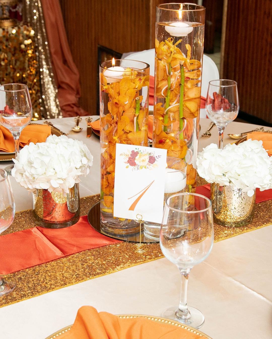 Tall glass cylinders filled with fiery orange florals and floating candles? Yes, please. This modern-meets-glam approach brings vertical interest without feeling heavy. The mirrored base, sequin linen, and gold-speckled votives seal the deal.