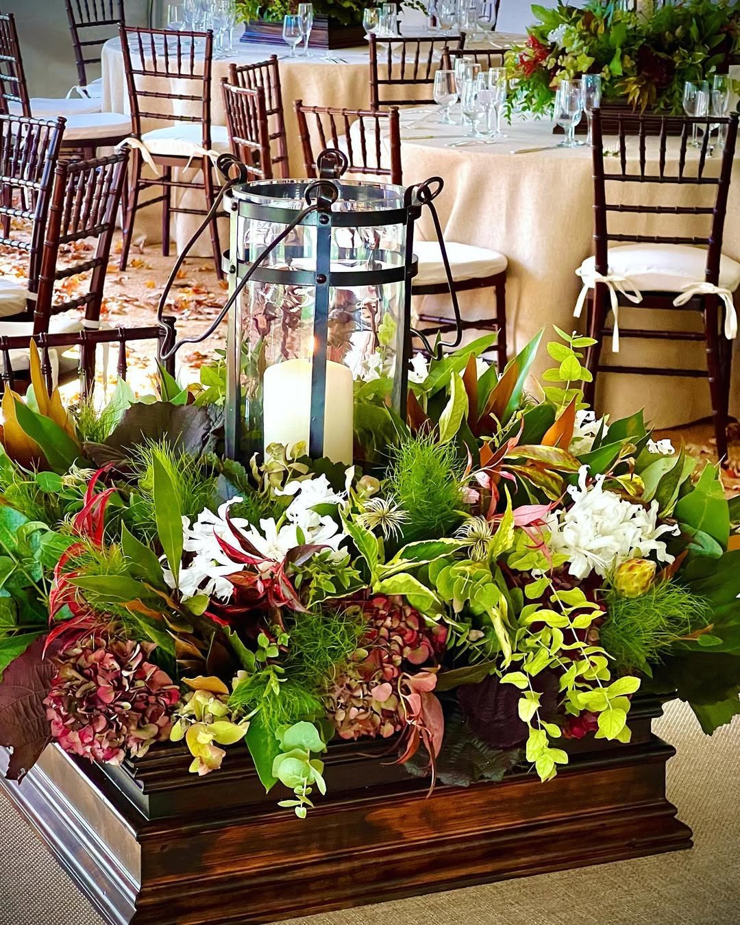 Low, lush, and dramatic in the coziest way possible. A hurricane lantern anchors this centerpiece, surrounded by deep green foliage, antique hydrangeas, and flickers of soft white blooms. It feels almost like it grew there—part garden, part storybook woodland.