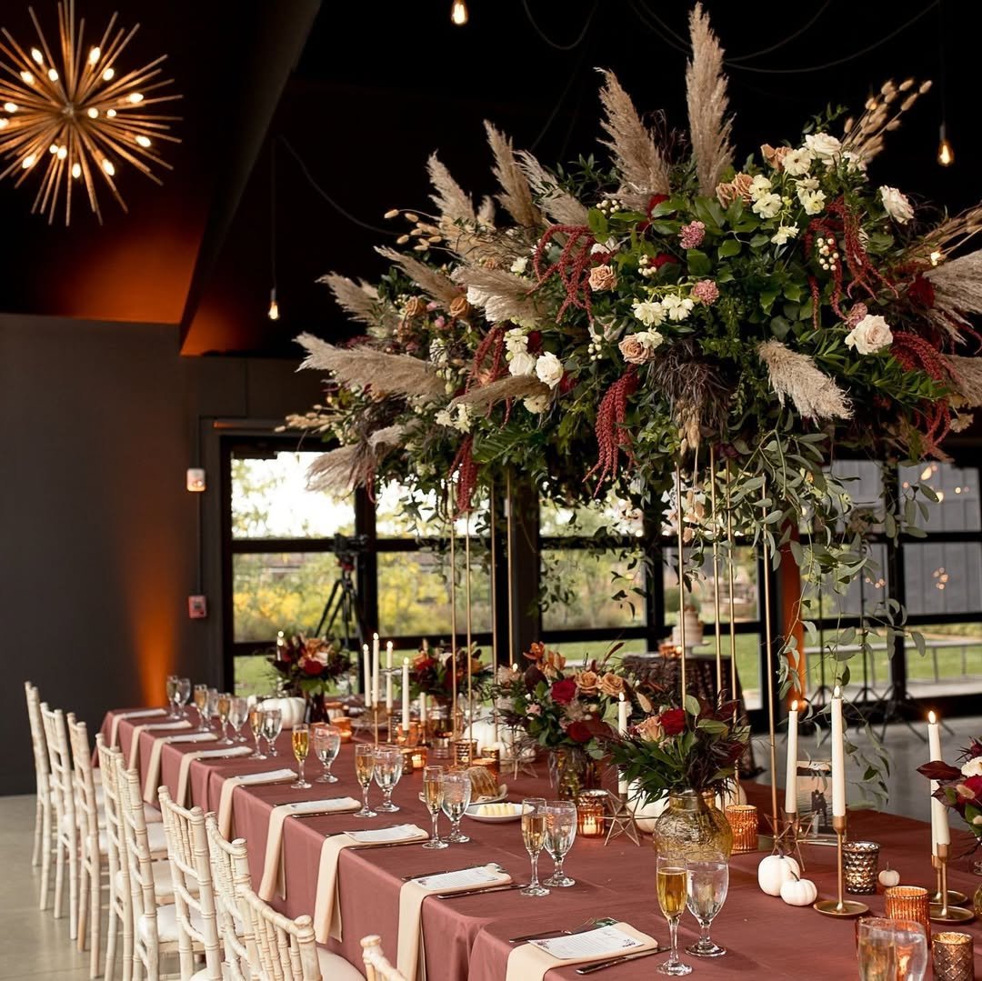 Set against a sea of glassware, the centerpiece shines even more. It’s luxe, it’s bold, and it feels like it belongs at a black-tie wedding with autumn’s richest tones.