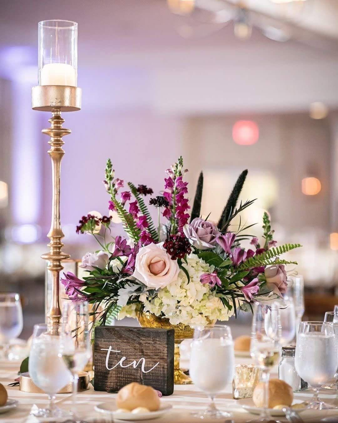 A tall gold taper, deep plum roses, mauve accents, and a base of white hydrangeas create an arrangement that feels straight out of a fall fairytale. The moody-meets-classic vibe is strong here—and we’re loving the contrast of dark blooms against blush tones.