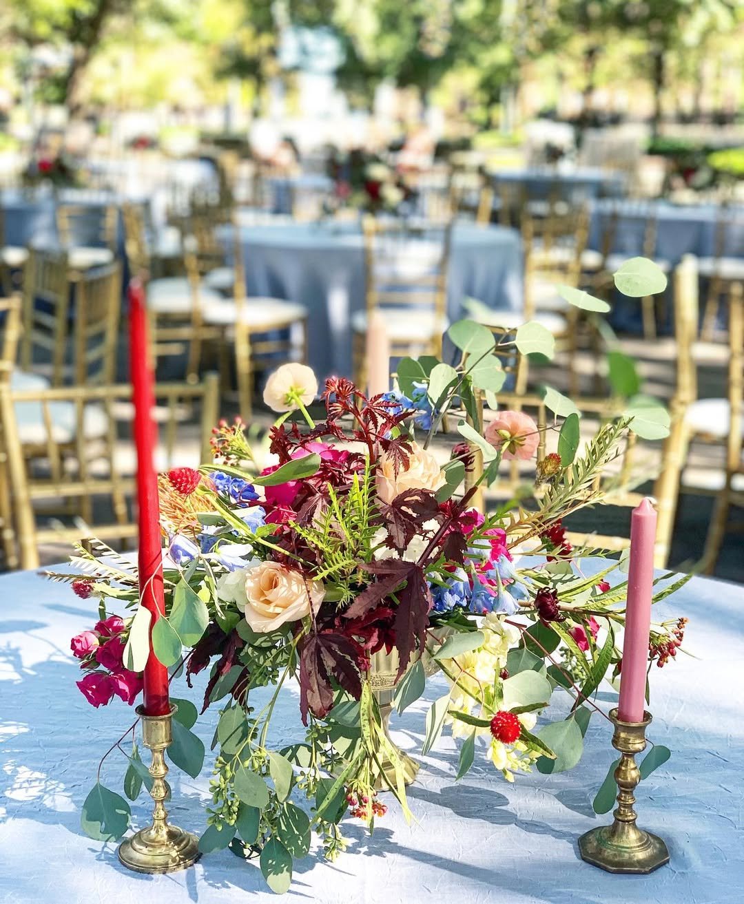This one’s got the kind of energy you’d expect from a vineyard elopement with a touch of whimsy. Loose, airy blooms in peaches, reds, and cornflower blue are mixed with wild sprigs of greenery and quirky taper candles in blush and crimson.
