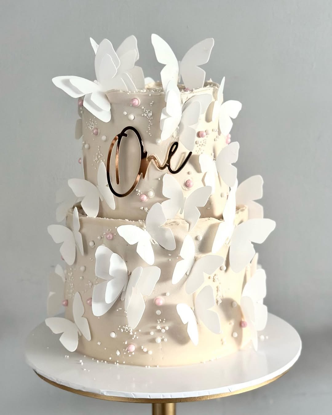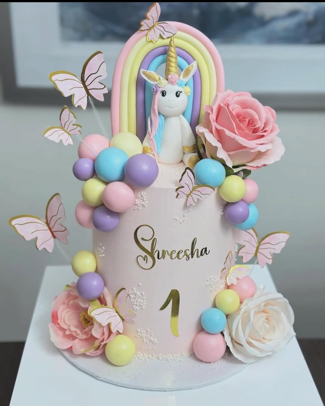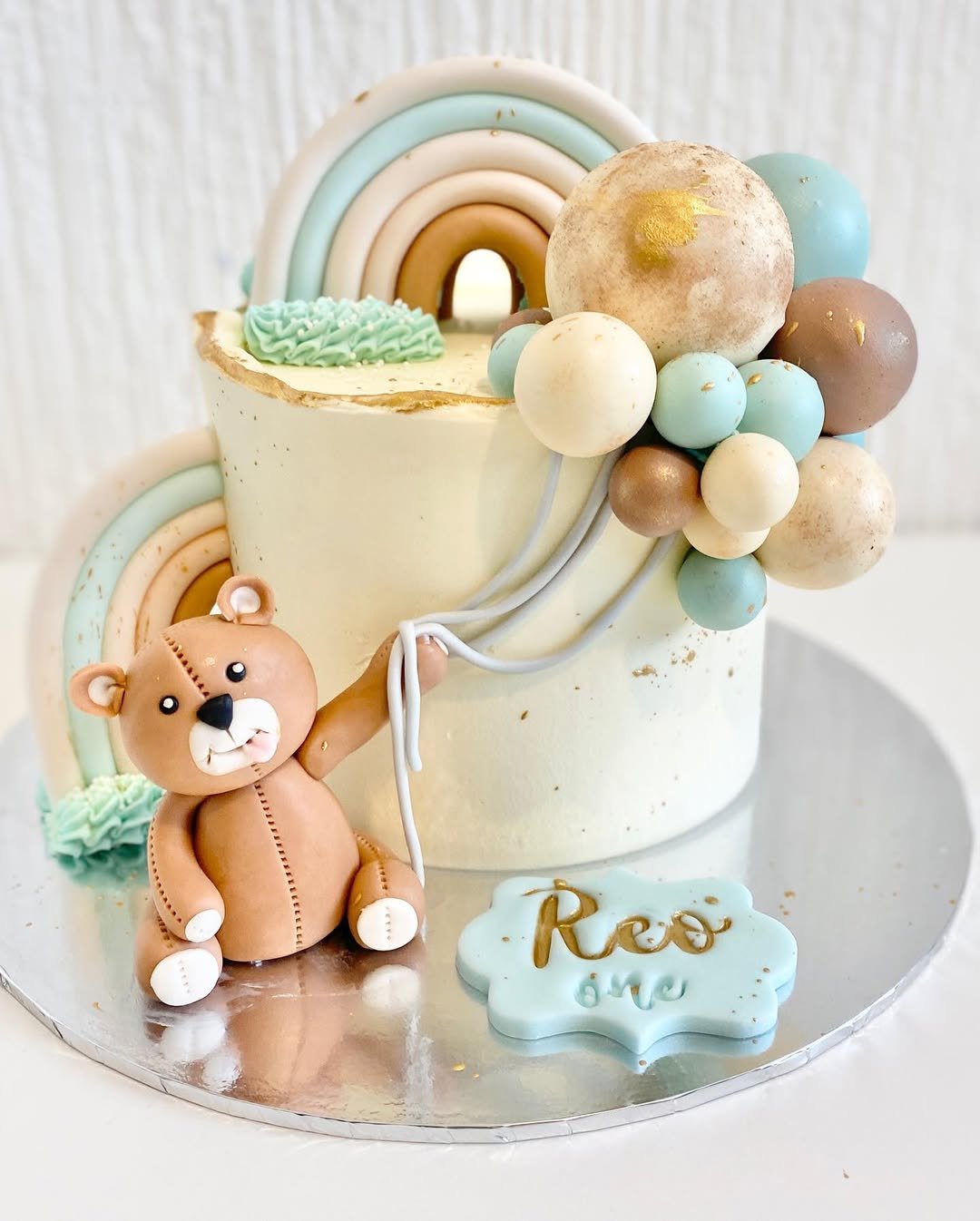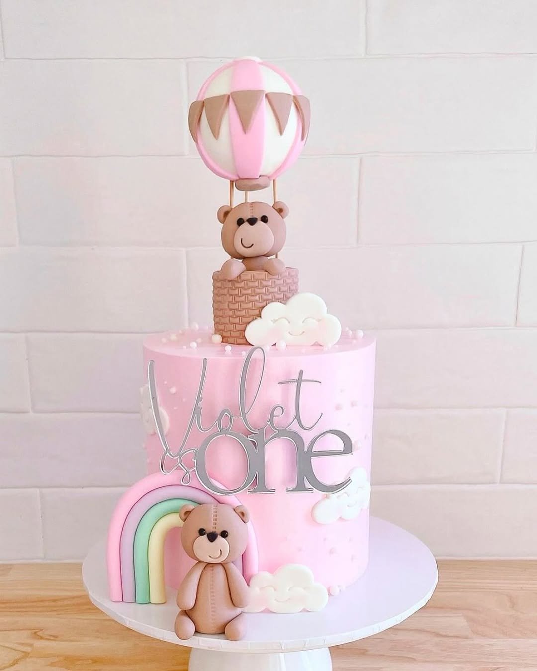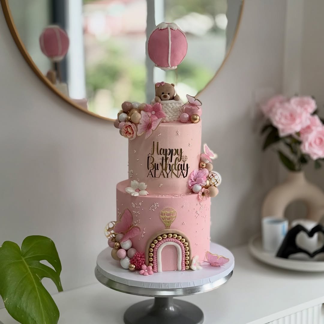 Pink, gold, butterflies, and a tiny hot air balloon—this cake basically has a Pinterest board all to itself. The little teddy riding in the balloon basket is pure cuteness overload, while the rainbow and pearls tie it all together.
