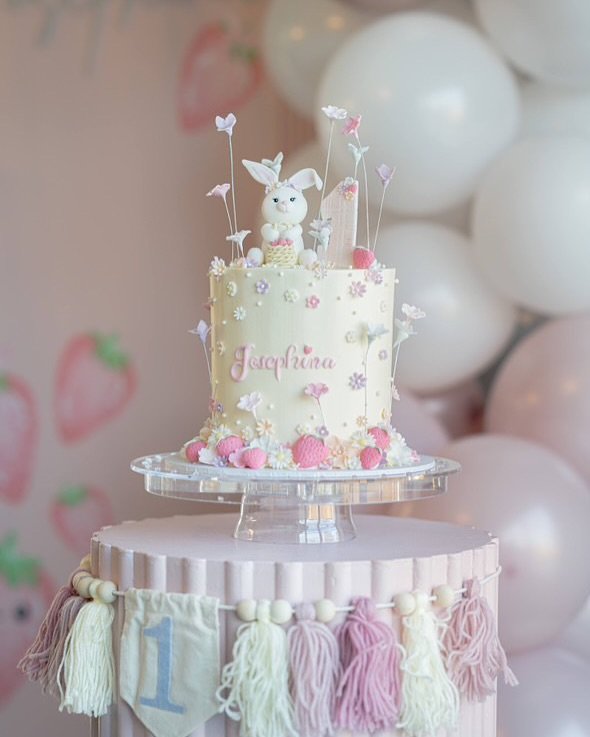 Pastel perfection with a bunny who’s clearly the queen of the strawberry patch. Soft florals, tiny fondant strawberries, and the cutest rabbit topper make this cake feel like a springtime dream.