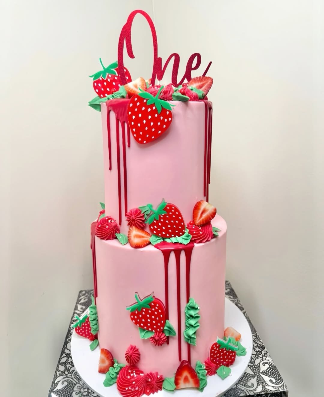 This cake is basically summer on a stand—bright strawberries, playful green leaves, and a glossy red drip that makes it look juicier than it has any right to be.