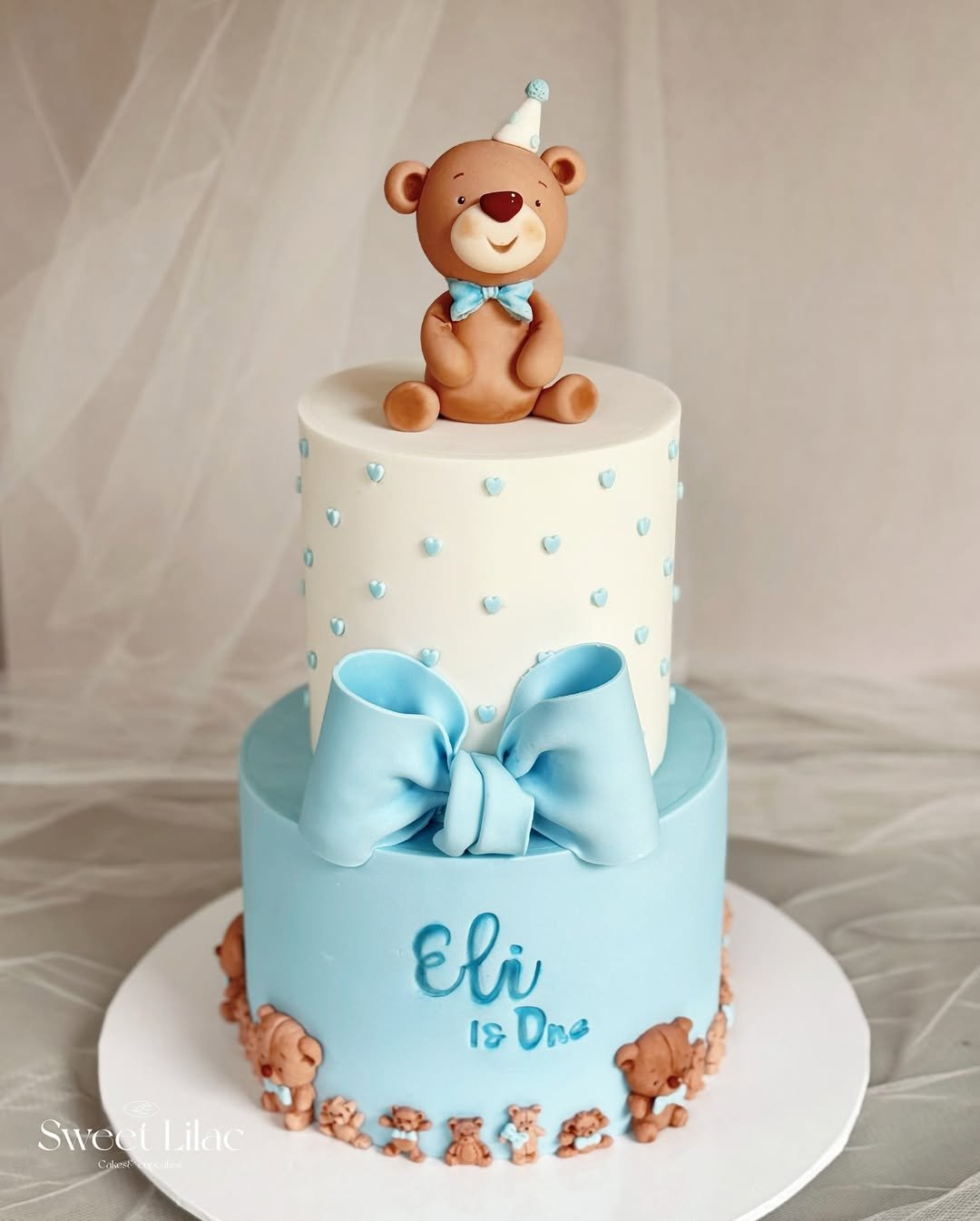 Sweet, simple, and oh-so-huggable, this cake is perfect for a little boy’s first big milestone. A fondant teddy in a party hat sits proudly on top, surrounded by soft blue hearts and a giant fondant bow.