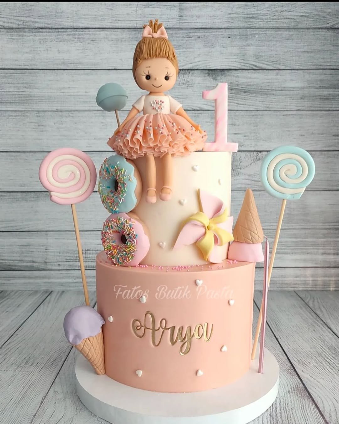 A cake that basically said, “Let’s make everything edible.” We’ve got fondant lollipops, sprinkled donuts, ice cream cones, and a princess perched proudly on top.