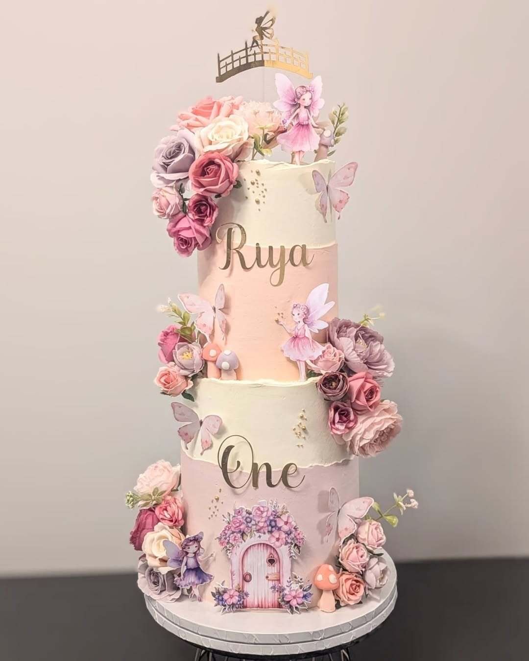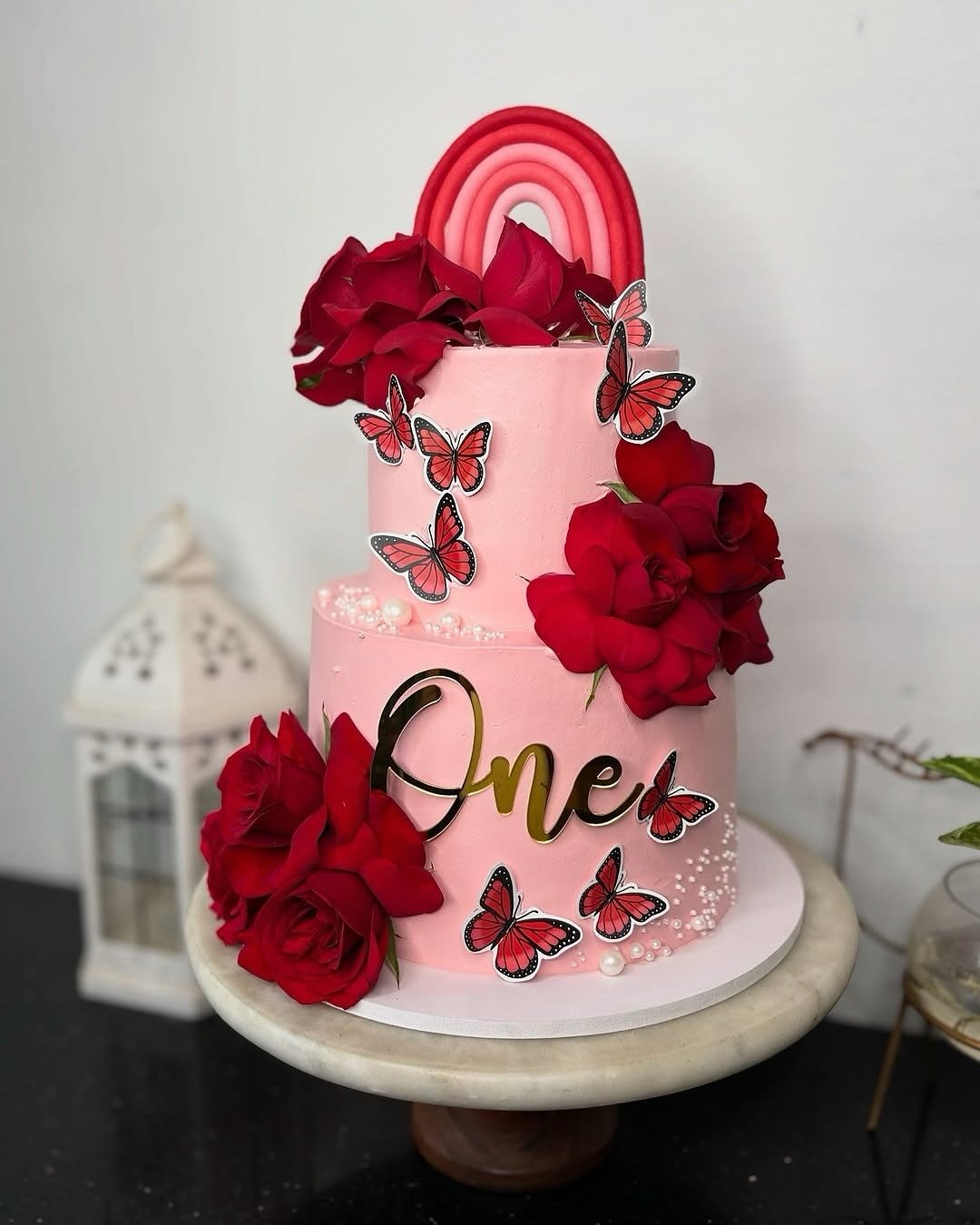 This cake is for the little one who deserves all the butterflies and roses. The deep red blooms against the pink tiers? Chef’s kiss.