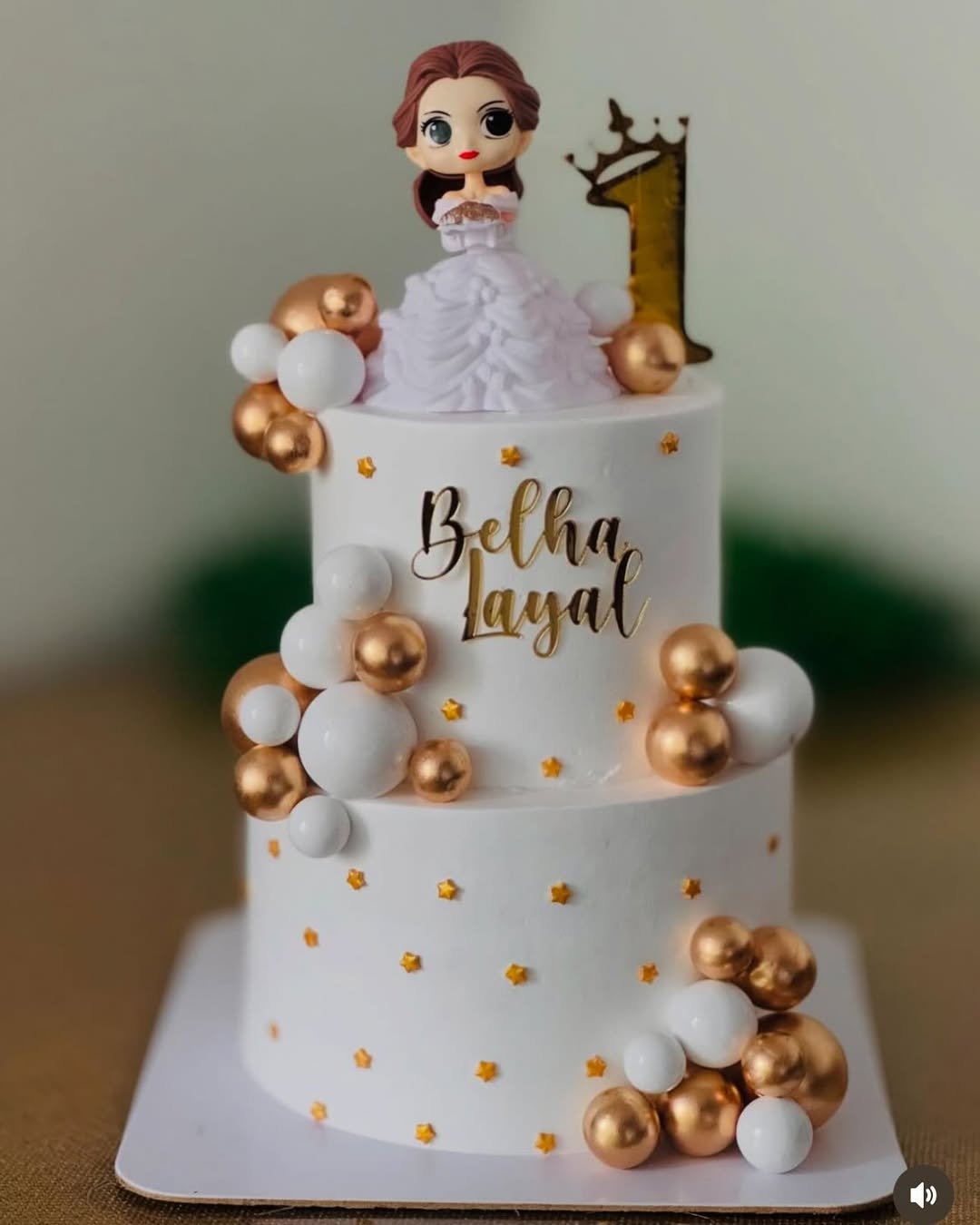Regal meets whimsical with gold balloons, starry sprinkles, and a doll topper in a gown fit for a mini queen. The clean white base makes those metallic accents really pop.