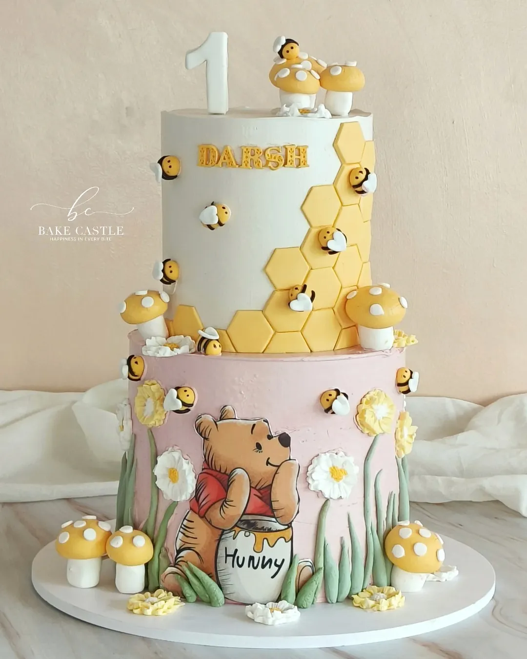 Winnie the Pooh would absolutely approve of this. A cake layered in honeycomb patterns, buzzing bees, and fondant mushrooms so cute you’d think they wandered straight out of a storybook. And can we talk about the hand-painted Pooh? He’s living his best “pots of hunny” life.