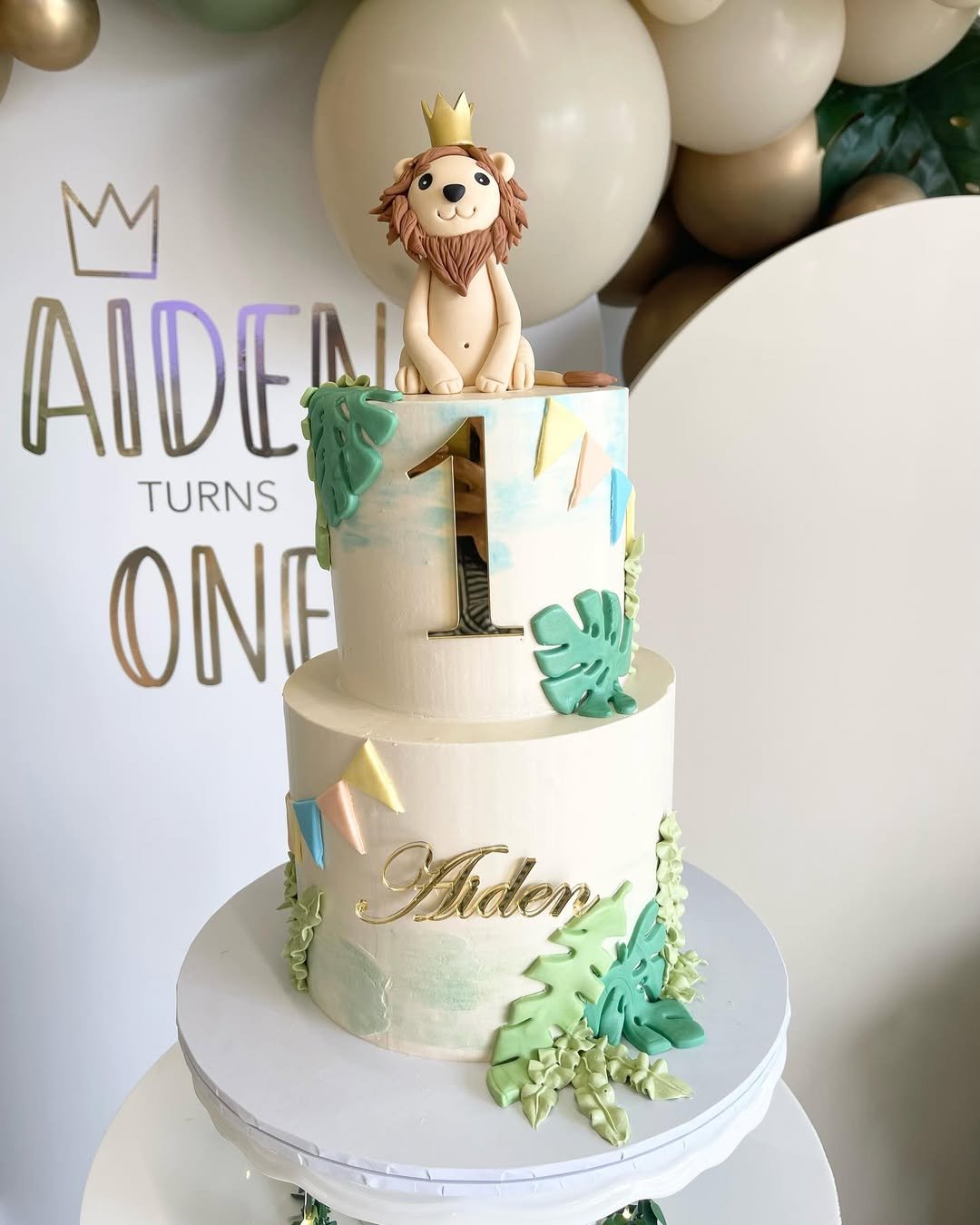 Aiden’s cake is giving serious “Lion King, but make it luxe” energy. The fondant lion with a tiny gold crown is sitting pretty atop a soft, watercolor-textured cake, surrounded by fondant monstera leaves like he’s surveying his kingdom.