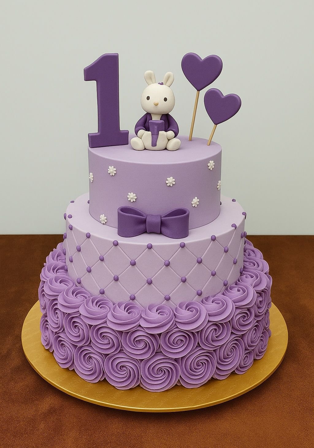 Lavender dreams are made of this. The top tier keeps it clean and classic, while the bottom tier is a full-on rosette explosion. Add in quilted fondant, tiny flowers, and a bunny that’s probably writing in its gratitude journal—it’s just perfection.