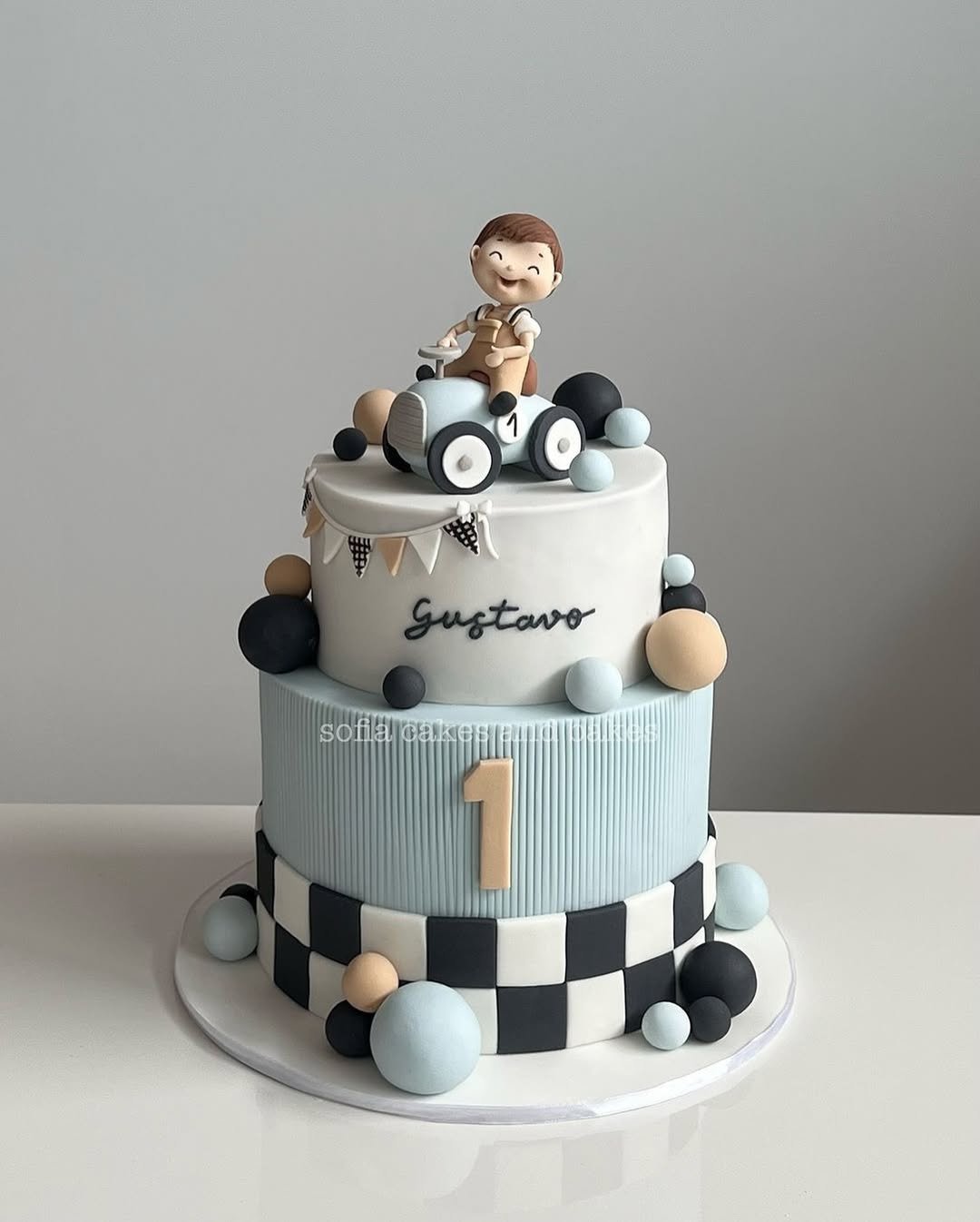 This one’s for the tiny speed demons out there. Cool blue tones, a racecar topper, and a checkered flag bottom tier that practically yells “start your engines!” without you needing a pit crew.