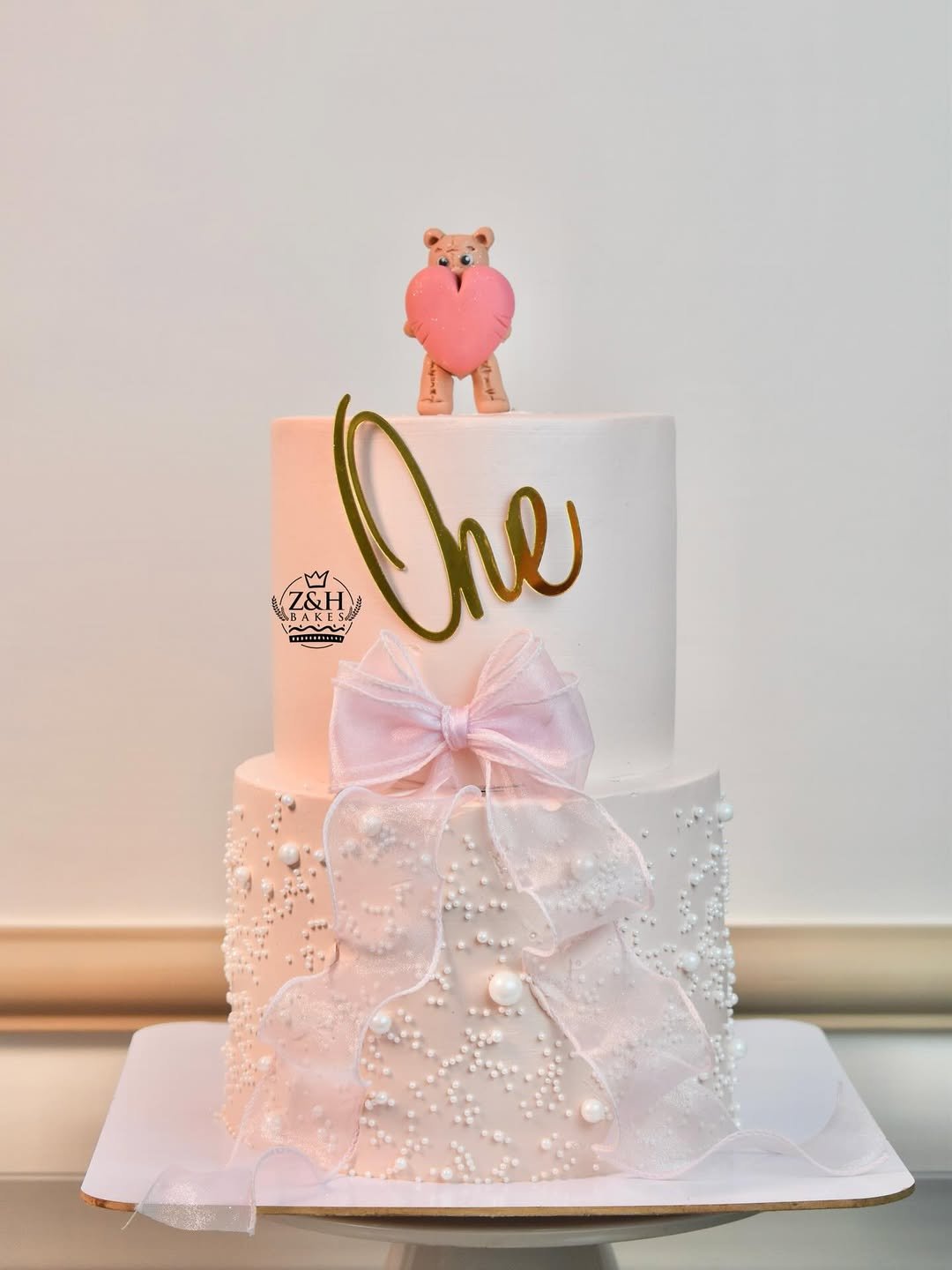 This is the Bridgerton of cakes—pearl-studded ruffles, a pink bow, and a teddy holding a heart so big it could power a rom-com trilogy. The gold “One” topper just seals the deal on the elegance.
