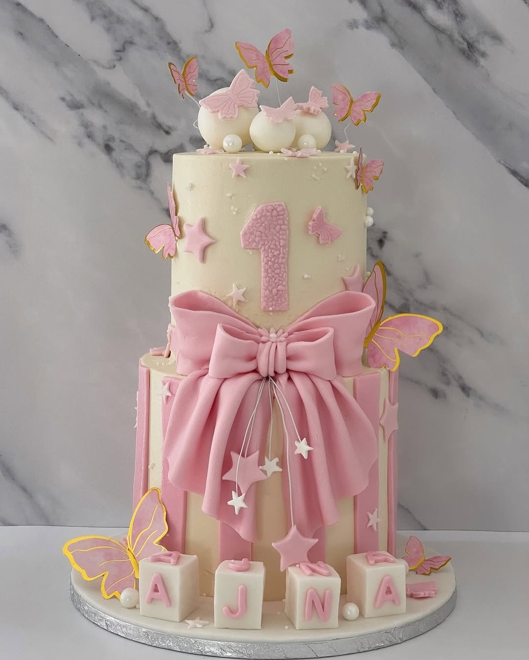 This one is unapologetically pink, and we love it for that. The giant fondant bow is basically the edible equivalent of a mic drop, with star-topped wires and fluttering butterflies making the whole cake feel like it’s mid-party.