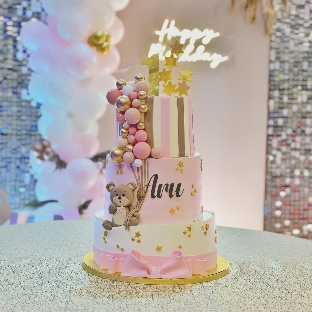 Aru’s cake is a starry pink-and-white wonderland with stripes, metallic gold stars, and a teddy bear holding on for dear life while sitting on the side tier. The balloon cluster made of edible spheres gives it height and flair without tipping into chaos.
