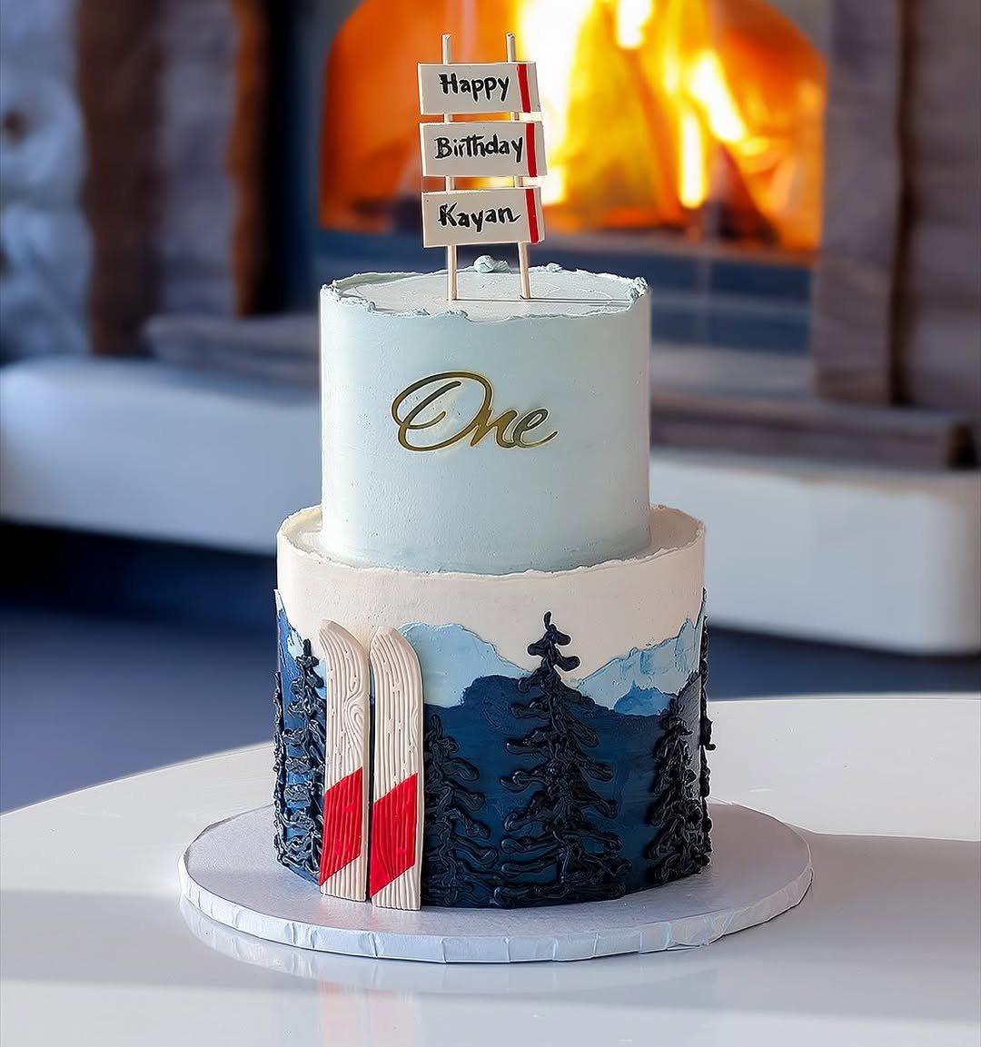 This one is for the little adventurer in training. A crisp blue-and-white cake painted with snowy mountain scenes and topped with tiny skis—it’s like the Alps, but in buttercream.