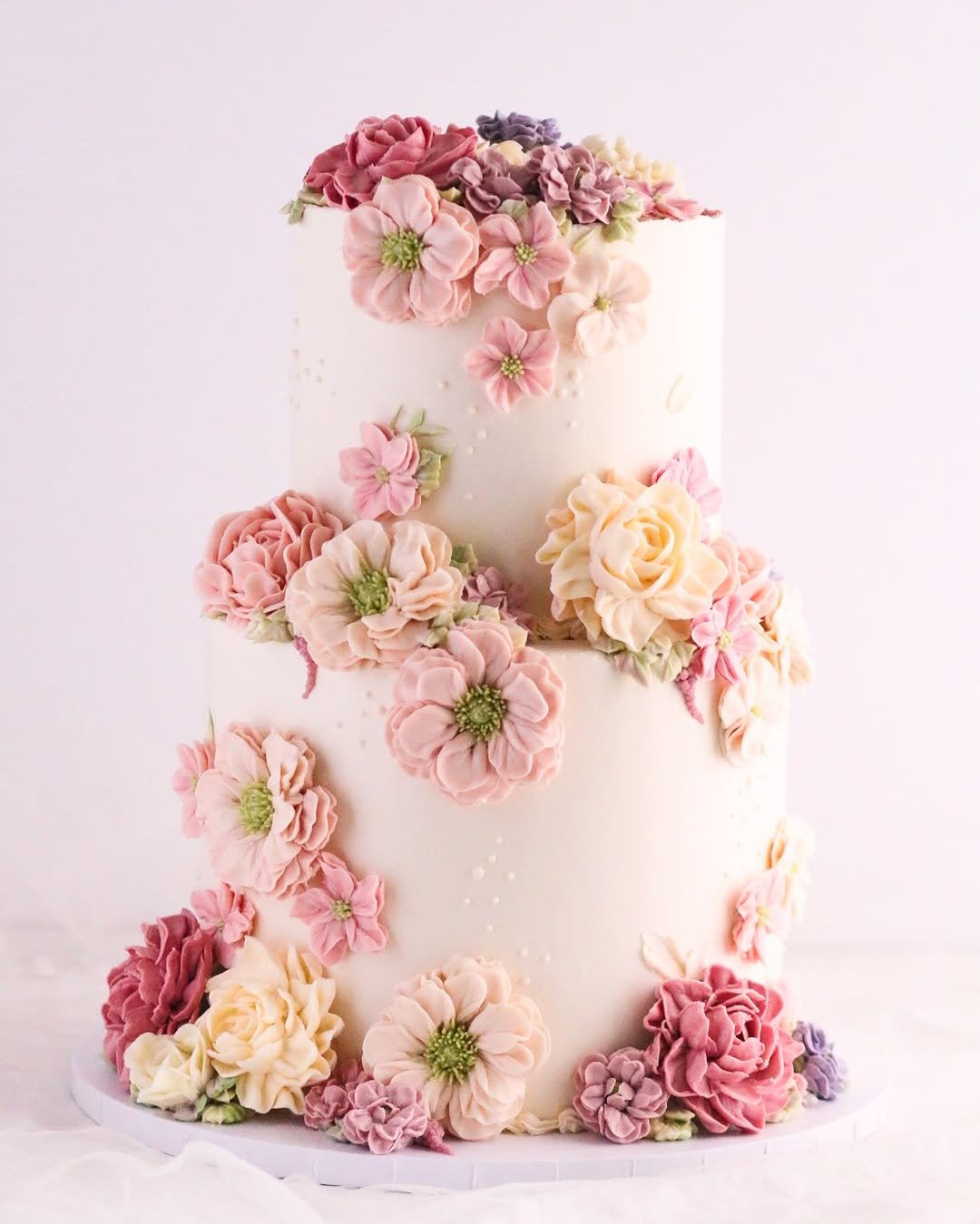 Soft, sculptural, and full of grace—this three-tier design is like a floral poem in buttercream. The blooms climb diagonally like a garden trellis, each one in those muted lilac, blush, and ivory tones that feel straight out of a Bridgerton dream.