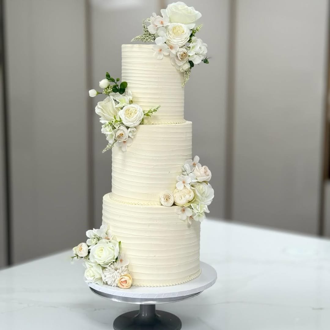 Here’s the cake equivalent of a pearl earring: timeless, polished, and always right. The clean horizontal lines give it a tailored, almost architectural feel, while soft white florals gently break the symmetry.