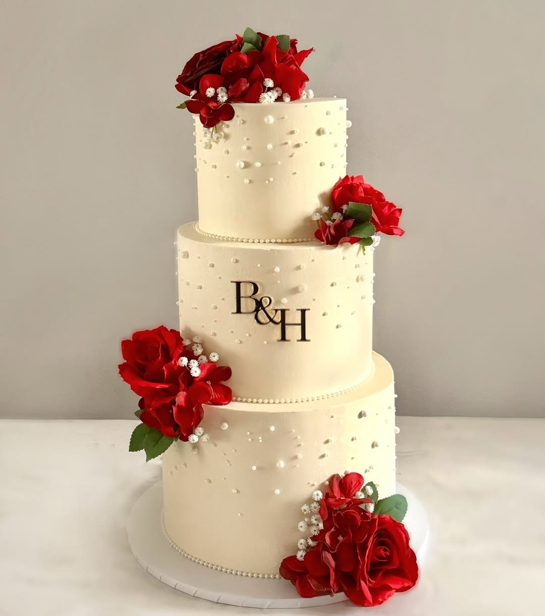 If ever a cake could channel a love letter, it’s this. Stark white tiers with clean pearl detailing make way for crimson and ruby red florals that bring all the drama. The balance of soft ivory and striking red is completely magnetic.