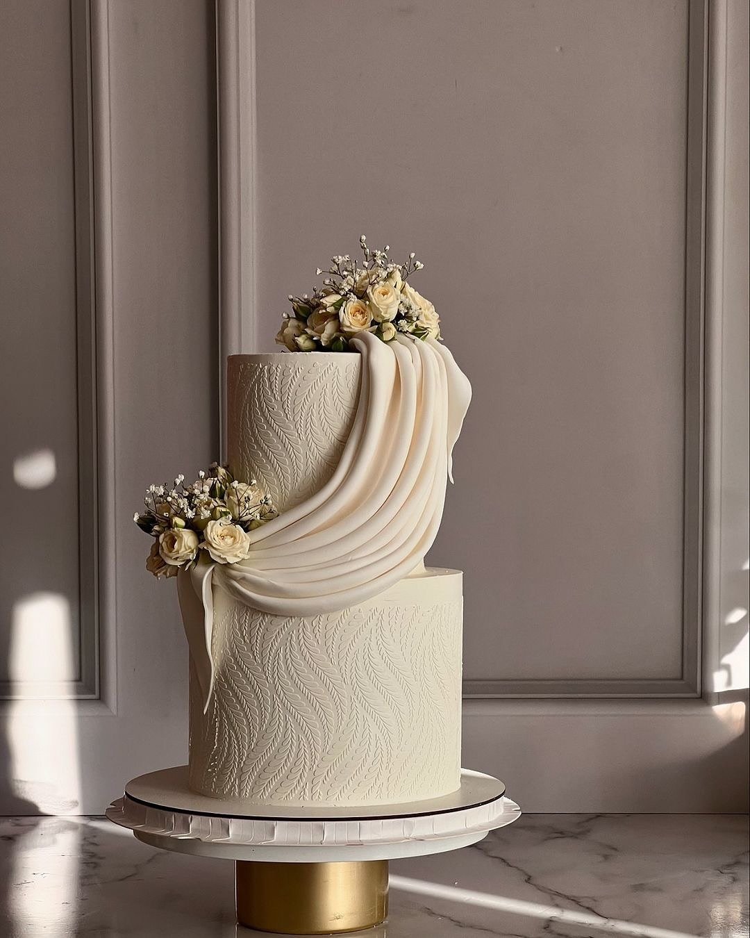 This one’s a masterclass in restraint. A minimal palette, a feathered texture, and that impossibly elegant fondant drape make this design feel more like a Grecian sculpture than a dessert.