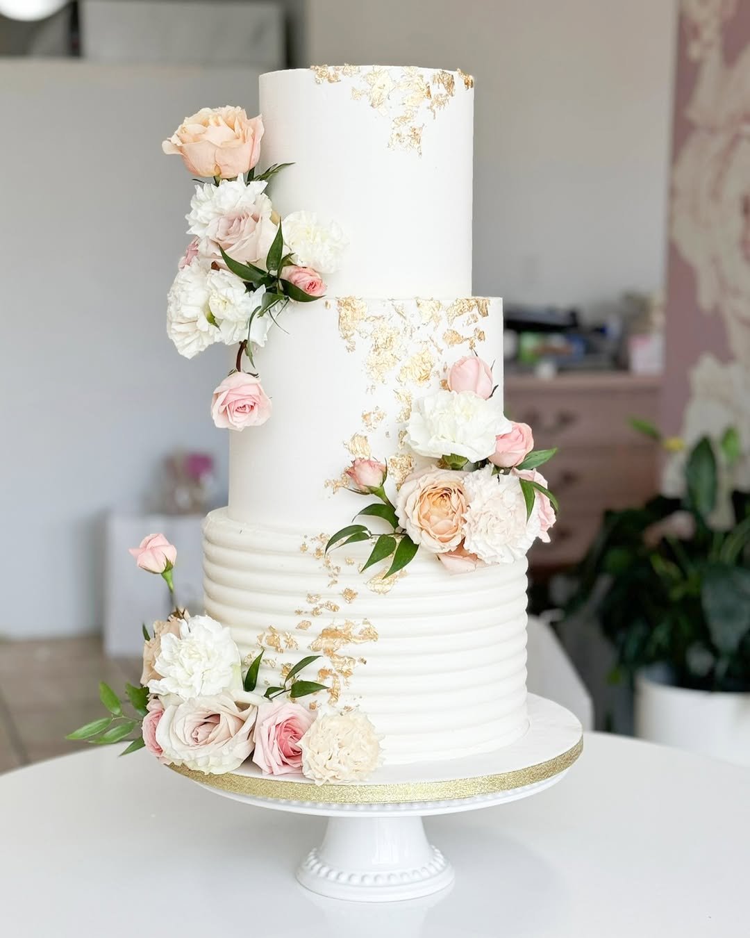 This is for the couple that’s classic at heart but still wants that “wow.” Three tiers, soft gold leafing, and a curated spray of blush, cream, and peach blooms — every element is refined, but there’s nothing stuffy here.