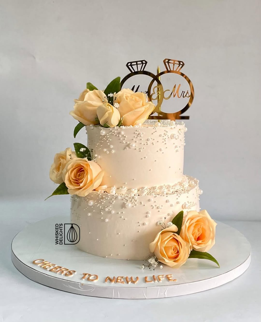 This one’s sweetly simple, with a playful pearl-studded base and fresh peach roses that bring in just enough color. The “Mr. & Mrs.” toppers add a fun, celebratory feel without stealing attention from those perfect floral placements.