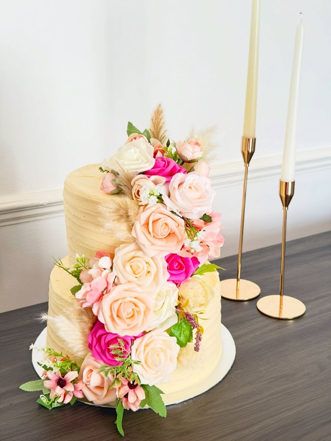 This cake feels like a garden stroll on a sun-warmed afternoon — soft, breezy, and blissfully romantic. Cascading roses in ivory, blush, and vibrant pink spill down buttercream layers, bringing a full bloom of texture and color. The gentle ripple effect in the frosting gives it that handmade, heartfelt touch.