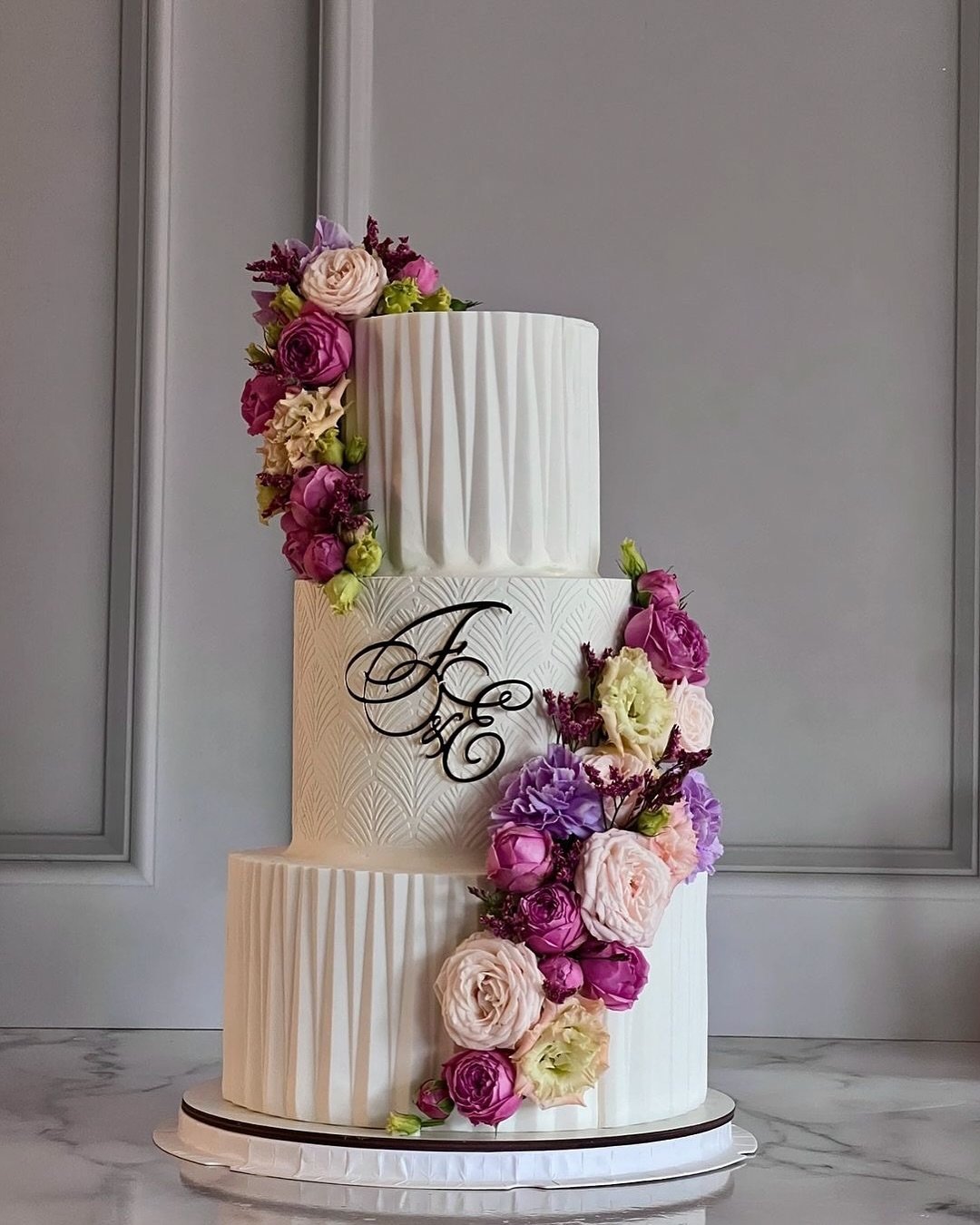 Bold florals meet refined architecture in this dreamy two-tier. With pleated fondant textures and a dramatic sweep of blush, plum, and lilac blooms, it’s every bit as sophisticated as it is spirited. The monogram adds that personal touch without disrupting the flow.