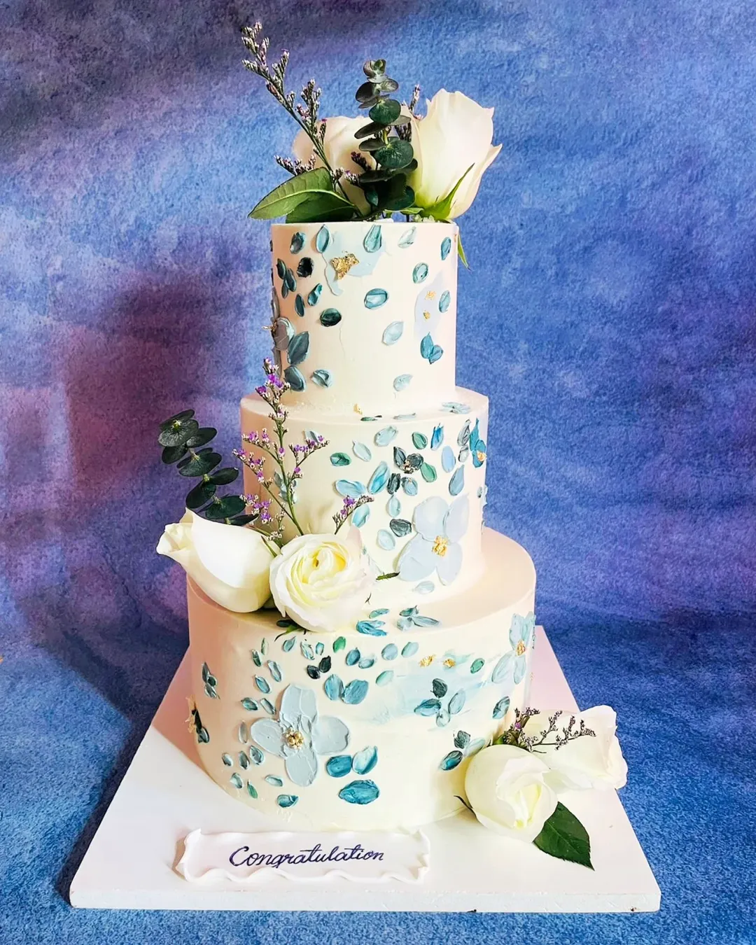 This one’s painterly, poetic, and quietly striking. Blue-toned petals swirl across the tiers in a loose, impressionist style, anchored by crisp white roses and eucalyptus sprigs. The whole thing feels fresh from a dreamscape.