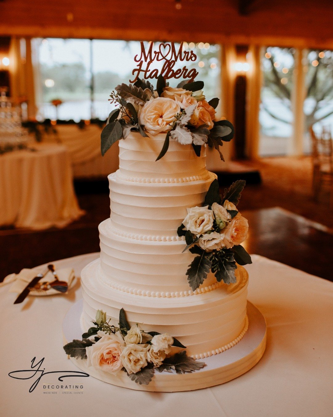 This cake glows like golden hour. Soft, peach-toned blooms pair beautifully with sage greens, all resting against smooth, ribbed buttercream tiers. It’s classic and warm — ideal for a cozy evening reception lit with fairy lights and candle flickers.