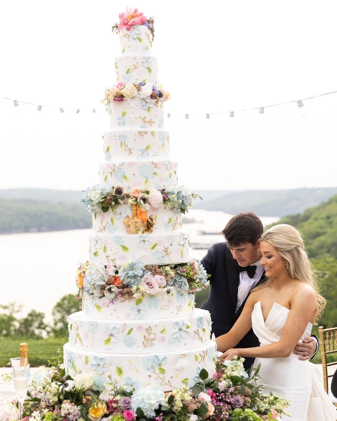 Nine. Tiers. Tall. This cake is less a dessert and more an architectural feat. But instead of feeling over-the-top, it’s softened by hand-painted florals and clusters of blooms that break up the height with garden-like rhythm.