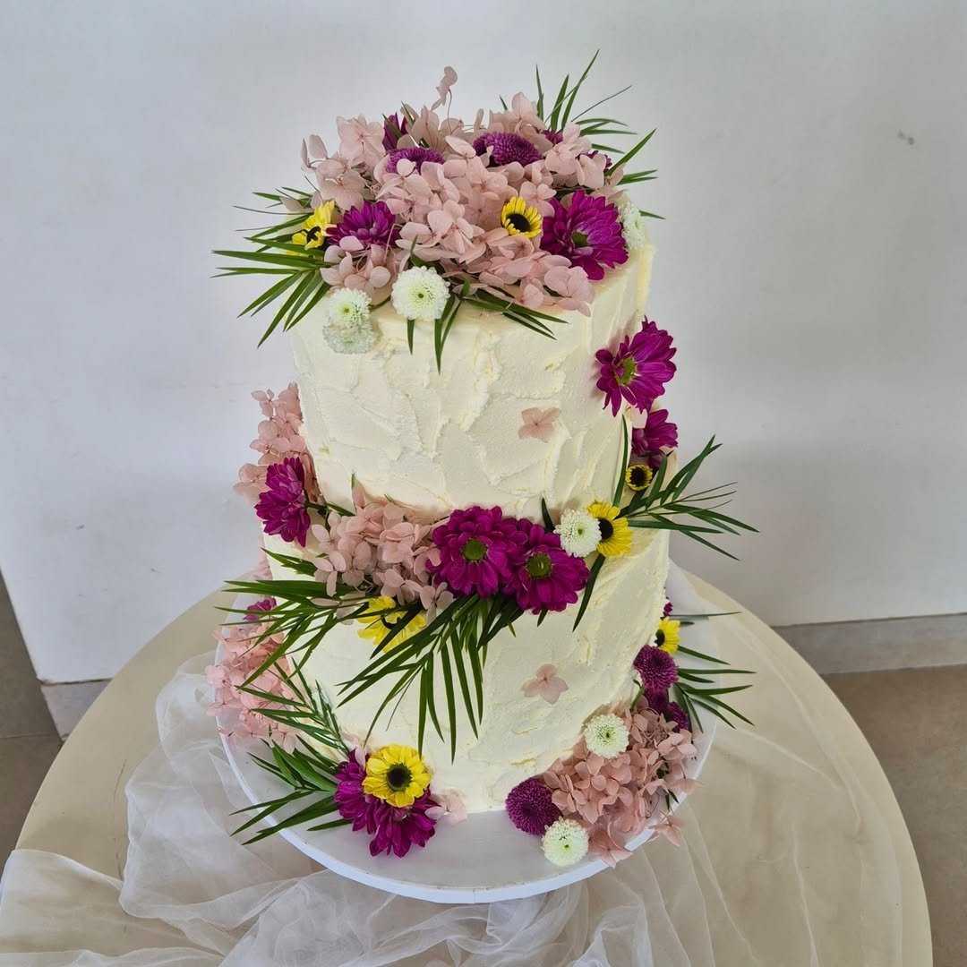 Playful and a little wild, this floral cake brings the garden straight to the dessert table. With bold purple blooms, dainty daisies, and wild grassy greens, it has that fresh-from-the-meadow energy that feels perfect for an outdoor wedding or anything a little less traditional.