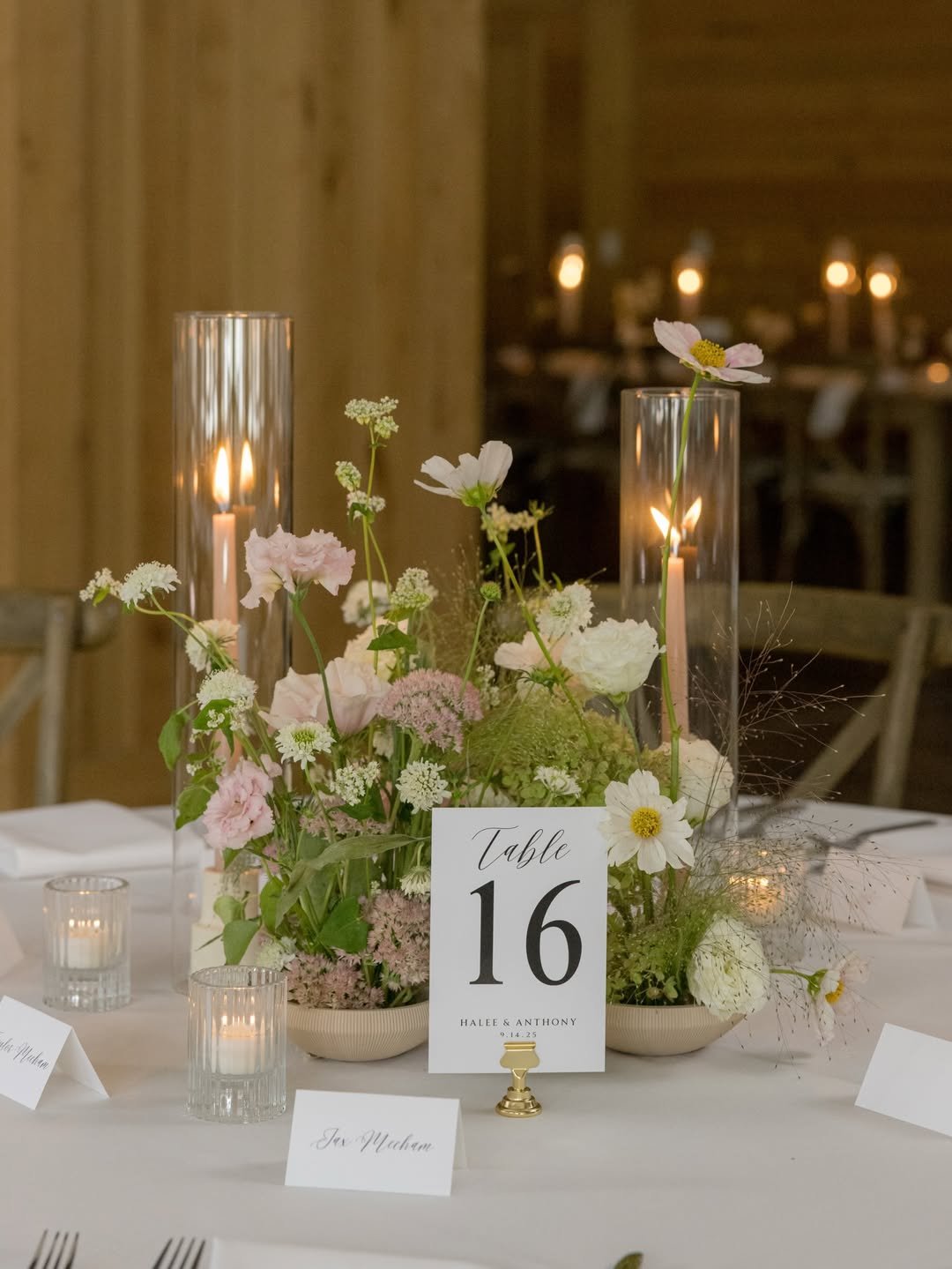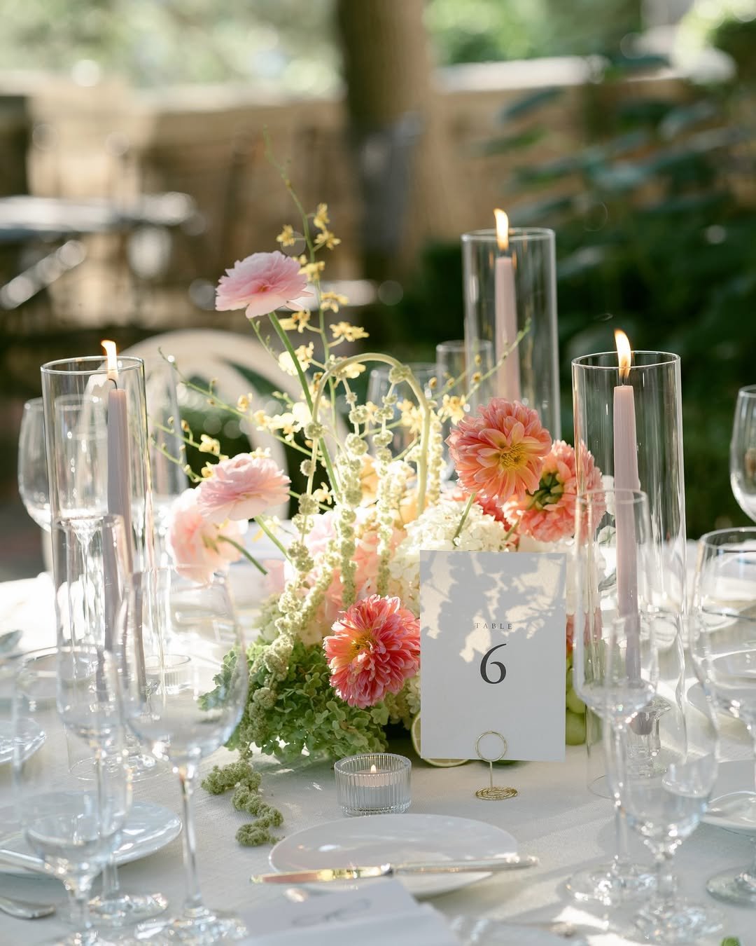 This one feels like golden hour captured on a table. Peach dahlias, pale ranunculus, and airy greenery glow against tall glass hurricanes, while the table number card adds a tailored touch.