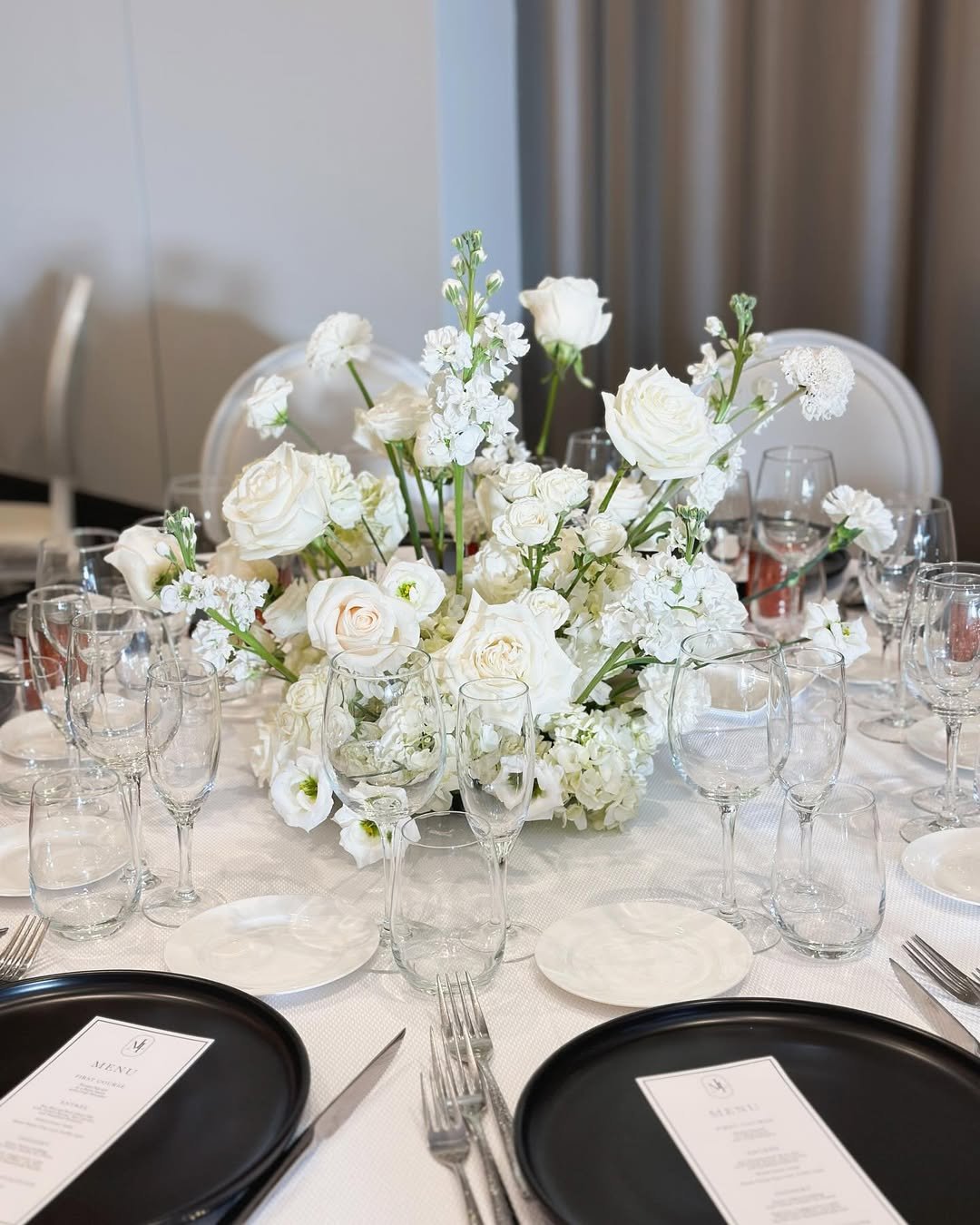 This centerpiece leans into abundance. Creamy roses, structured blooms, and thoughtful spacing between stems create height without overwhelming the table.